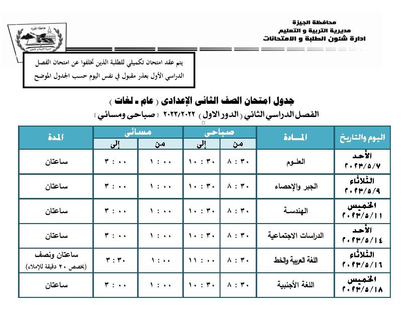 الصف الثاني الإعدادي (عام, صم، مكفوفين،مهنى ) يبدأ من الأحد 7 / 5 / 2023 إلى الخميس 18 / 5 / 2023