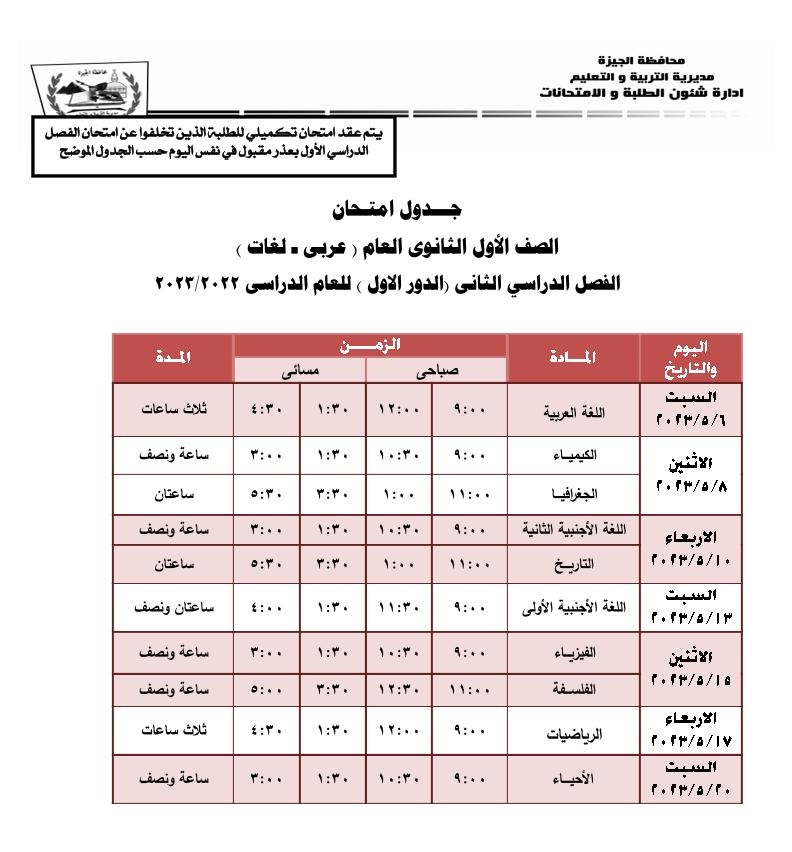 الصف الأول الثانوي العام يبدأ من السبت 6 / 5 / 2023 إلى السبت 20 / 5 / 2023