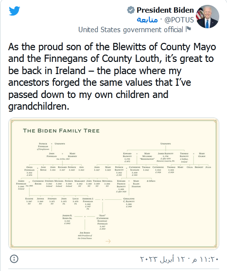 وعلى حسابه في "تويتر"، نشر بايدن صورة لشجرة عائلته وأصوله، معلقًا عليها بالقول: "بصفتي الابن الفخور لعائلة بلويتس في مقاطعة مايو، وعائلة فينيجانز في مقاطعة لاوث، إنه لأمر رائع أن أعود إلى إيرلندا.. المكان الذي صاغ فيه أسلافي نفس القيم التي نقلتها إلى أطفالي وأحفادي".