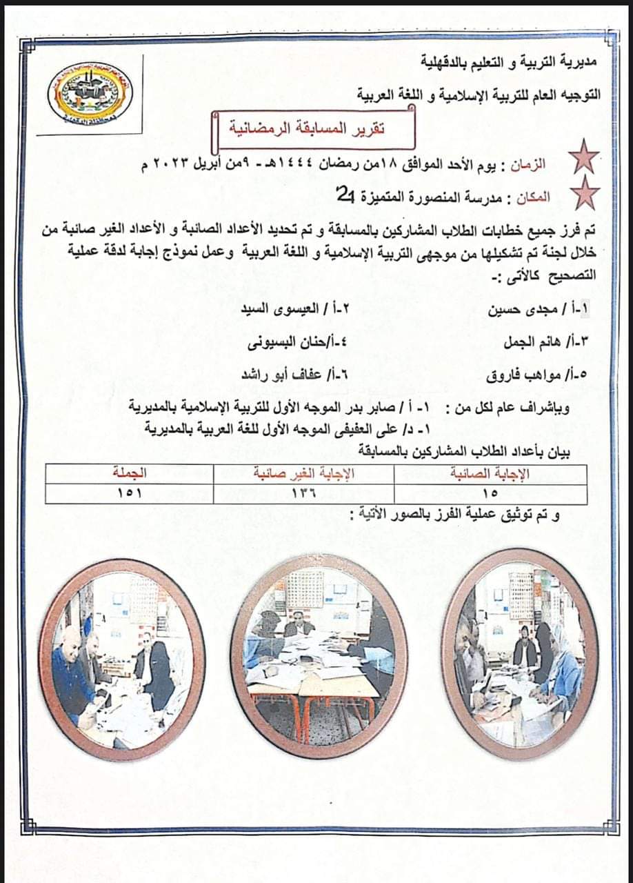وتم فرز جميع الخطابات المرسلة من الطلاب المشاركين بالمسابقة حيث أرسل ١٥١ طالبًا وطالبة الإجابات وكانت الإجابات الصائبة ١٥ إجابة والخاطئة ١٣٦ وسيتم تكريم الطلاب الفائزين برعاية وكيل وزارة تعليم الدقهلية ووكيل مديرية تعليم الدقهلية الثلاثاء المقبل الساعة العاشرة صباحًا.