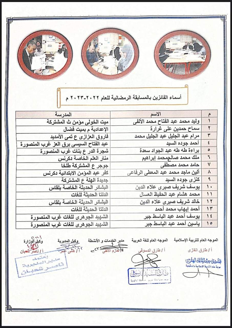 ننشر أسماء 15 فائزا بالمسابقة الرمضانية لتعليم الدقهلية