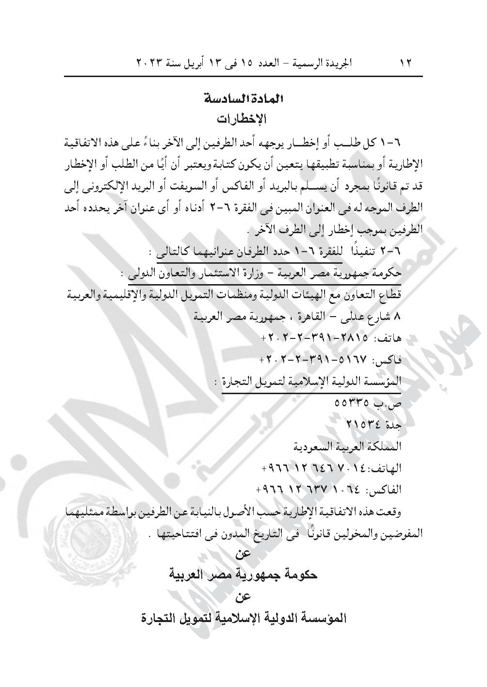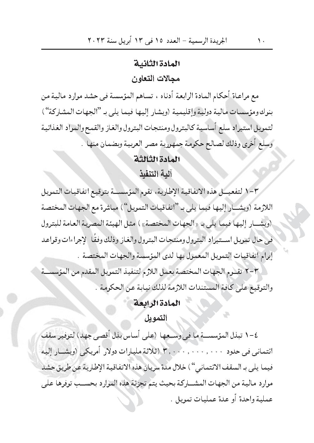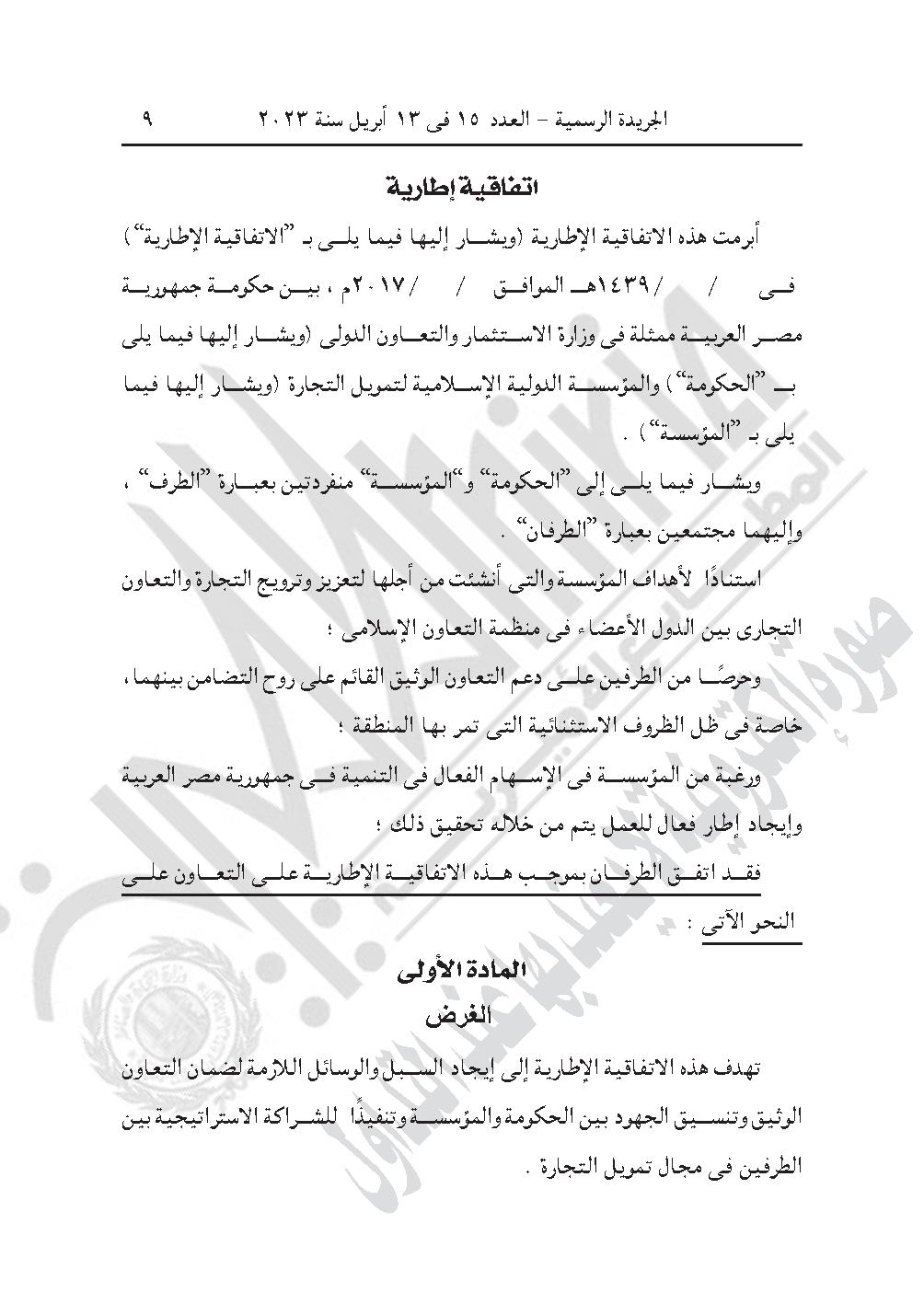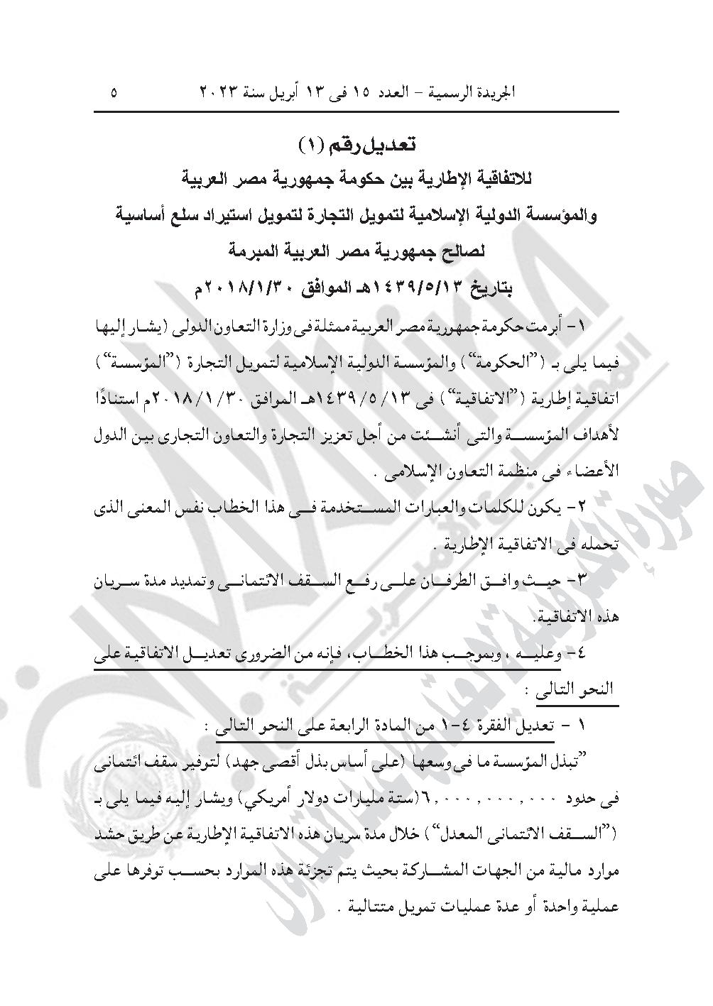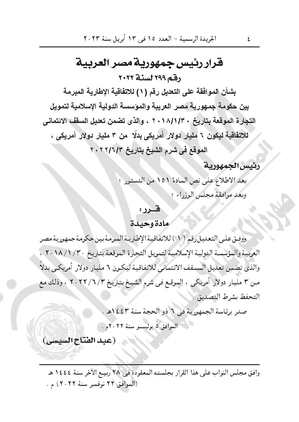وجاء في القرار الموافقة على التعديل رقم (1) للاتفاقية الإطارية المبرمة بين حكومة جمهورية مصر العربية والمؤسسة الدولية الإسلامية لتمويل التجارة الموقعة بتاريخ 30 /1 /2018، الذى تضمن تعديل السقف الائتمانى للاتفاقية ليكون 6 مليارات دولار أمريكي بدلًا من 3 مليار دولار أمريكى، الموقع فى شرم الشيخ بتاريخ 3/6/2022، وذلك مع التحفظ بشرط التصديق.
