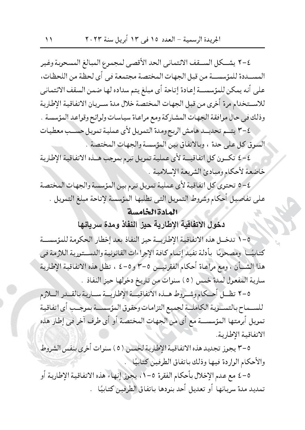 نشرت الجريدة الرسمية في عددها رقم 15، الصادر في 13 أبريل 2023، قرار جمهوري جديد رقم 299 لسنة 2023 للرئيس عبد الفتاح السيسي، بشأن الموافقة على تعديل الاتفاقية الإطارية المبرمة بين حكومة جمهورية مصر العربية والمؤسسة الدولية الإسلامية لتمويل التجارة، وذلك بتعديل السقف الائتماني للاتفاقية ليكون 6 مليار دولار أمريكي بدلًا من 3 مليار دولار أمريكي.