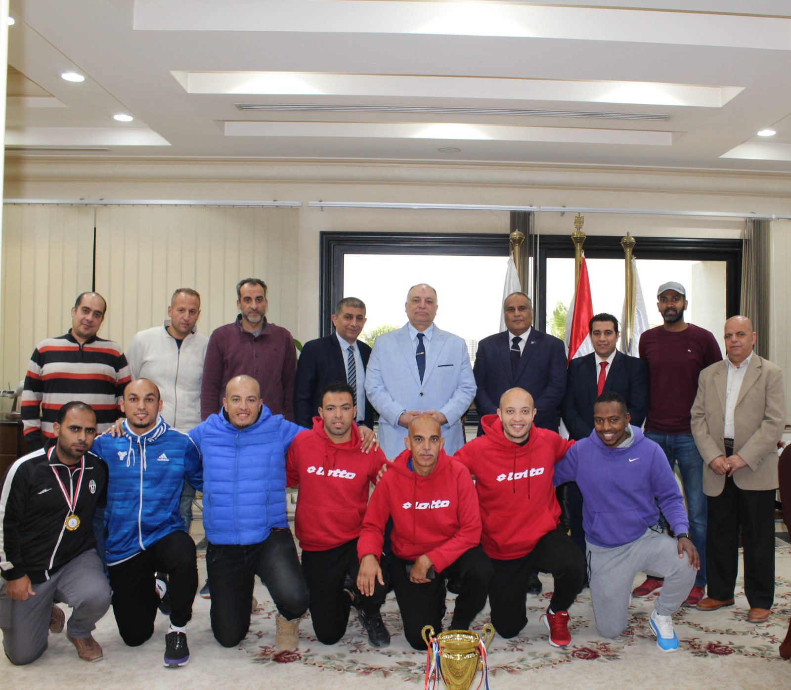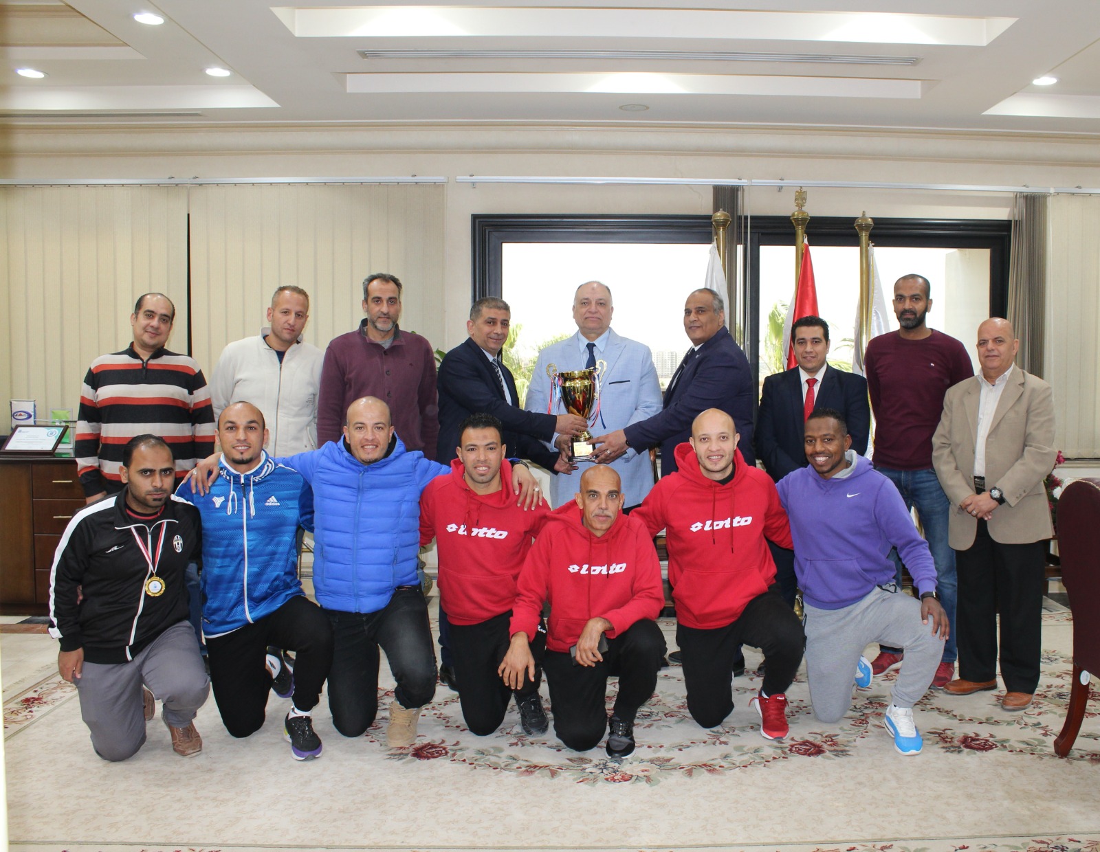 وهنأ المهندس محمد سعيد محروس خلال استقباله للجهاز الفني واللاعبين والقائمين على النشاط الرياضي بالشركة برئاسة الملاح خالد الألفي مساعد رئيس مجلس الإدارة والمشرف على فريق كرة القدم والمحاسب عبد ربه الأشول ومحمد عثمان سكرتير عام اللجنة الفريق وجميع العاملين بهذا النجاح وأثنى على الجهود المخلصة التي يقوم بها فريق كرة القدم الخماسي باستمرار مشددا على أهمية ممارسة الرياضة للعاملين للتمتع بنمط حياة صحي وفي ختام اللقاء تم تقديم شهادات تقدير والتقاط الصور التذكارية مع الفريق.