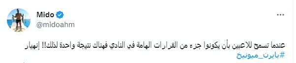 وكتب أحمد حسام "ميدو" عن فضيحة بايرن ميونخ فقال: "عندما تسمح للاعبين بأن يكونوا جزءا من القرارات الهامة في النادي فهناك نتيجة واحدة لذلك!! إنهيار #بايرن_ميونيخ"