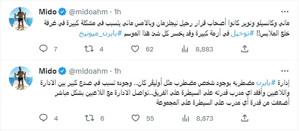 وقال ميدو عن انهيار بايرن ميونخ: "إدارة #بايرن مضطربة بوجود شخص مضطرب مثل أوليڤر كان.. وجوده تسبب في صدع كبير بين الإدارة واللاعبين وأفقد أي مدرب قدرته على السيطرة على الفريق..تواصل الإدارة مع اللاعبين بشكل مباشر أضعفت من قدرة أي مدرب على السيطرة على المجموعة"