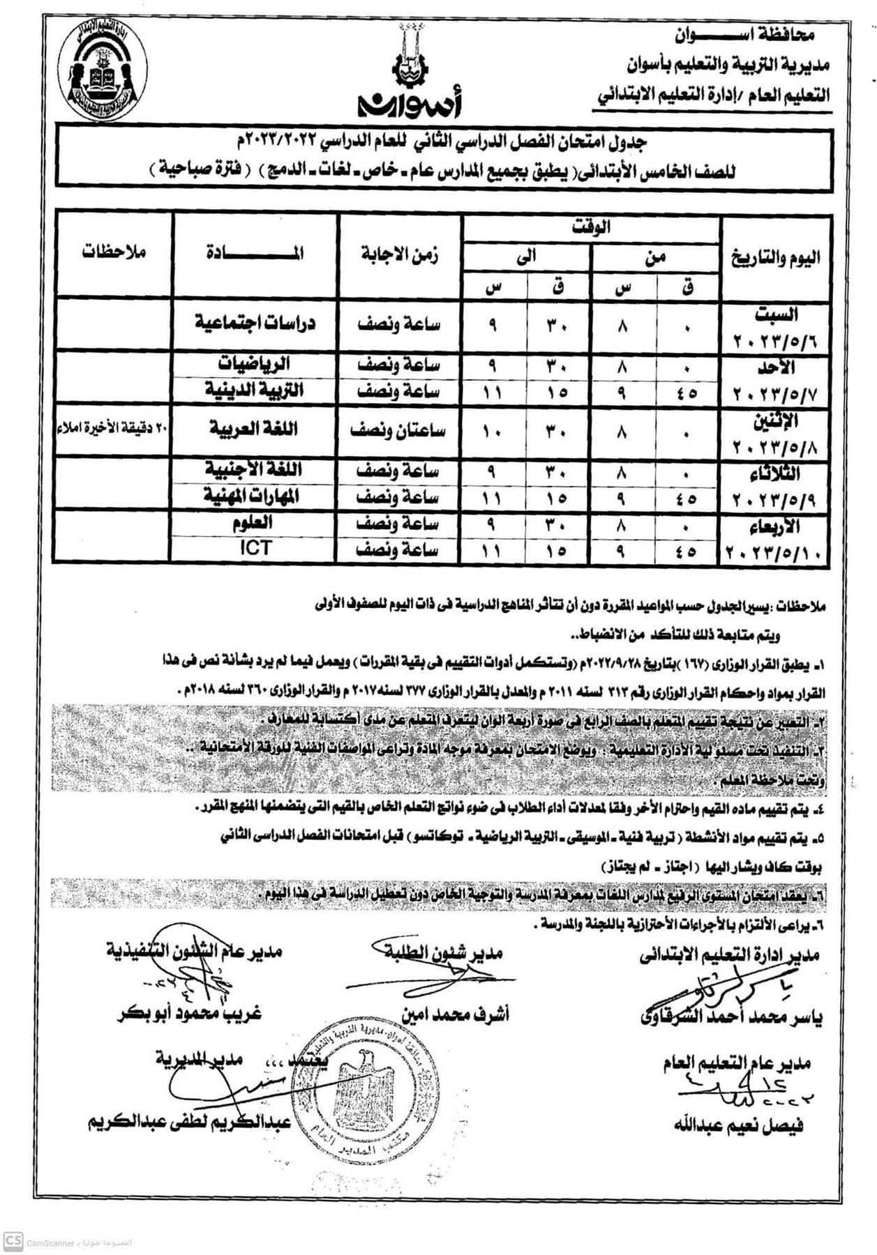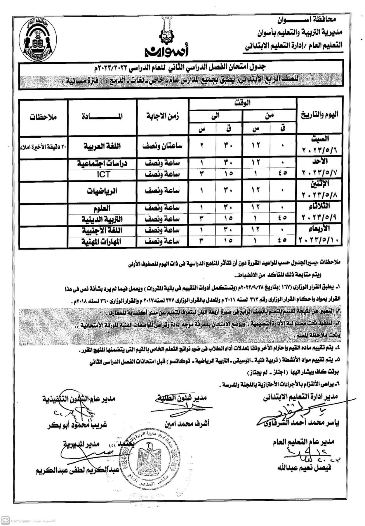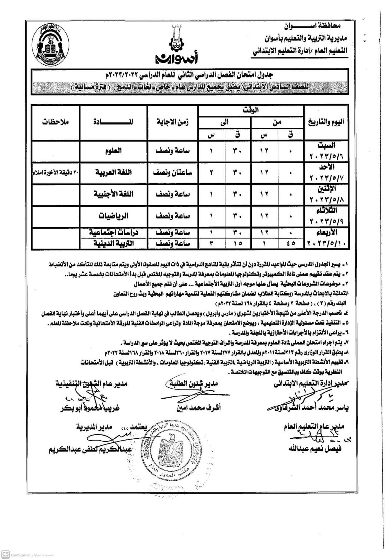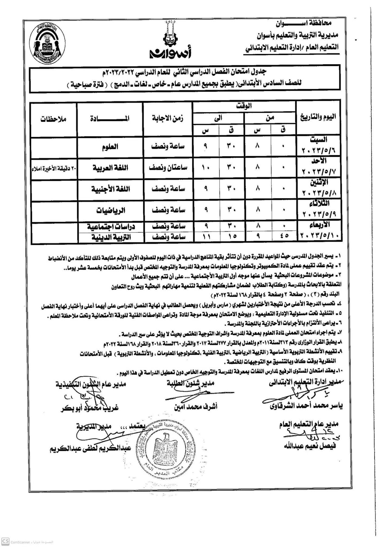 أعلنت مديرية التربية والتعليم بأسوان جداول امتحانات الفصل الدراسى الثانى للصفوف الرابع والخامس والسادس الابتدائى لمدارس الفترة الصباحية والمسائية وللطلاب المتغيبين بعذر عن الفصل الدراسى الأول عام وخاص ولغات ودمج للعام الدراسى 2023/2022.