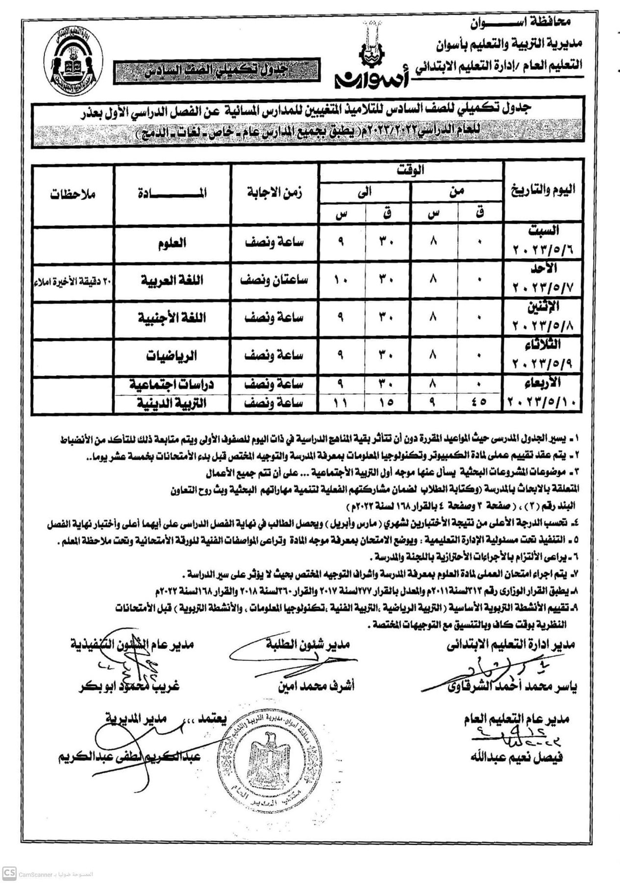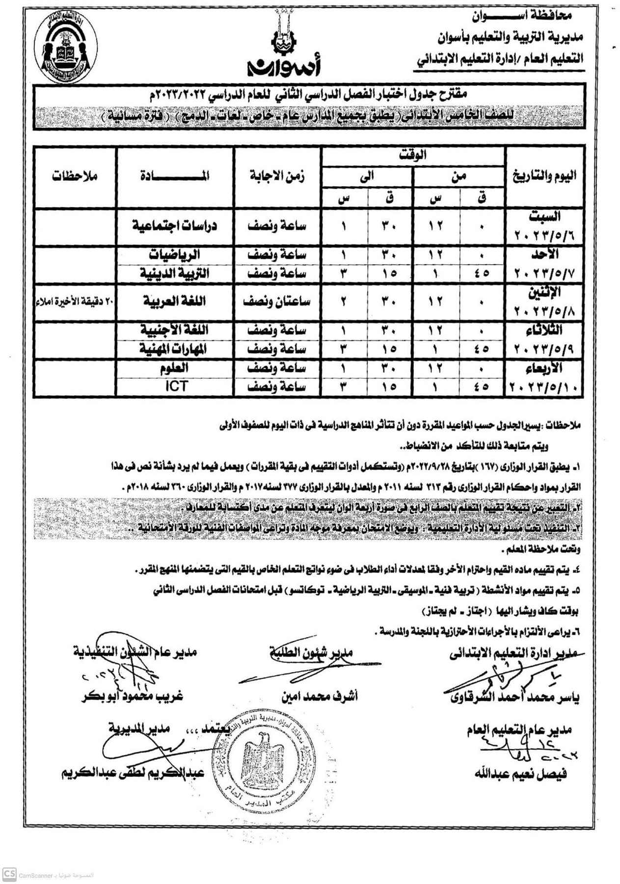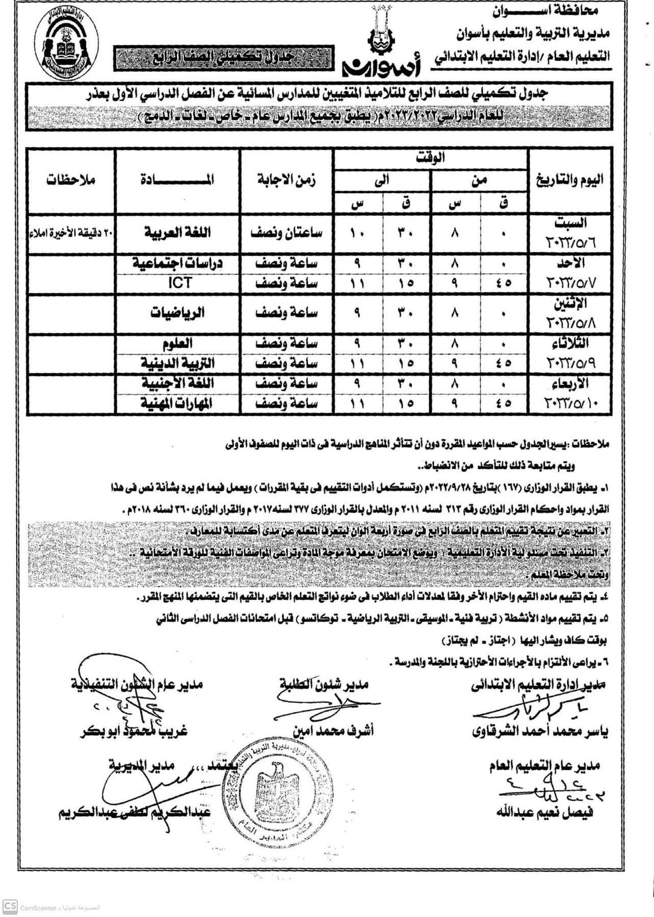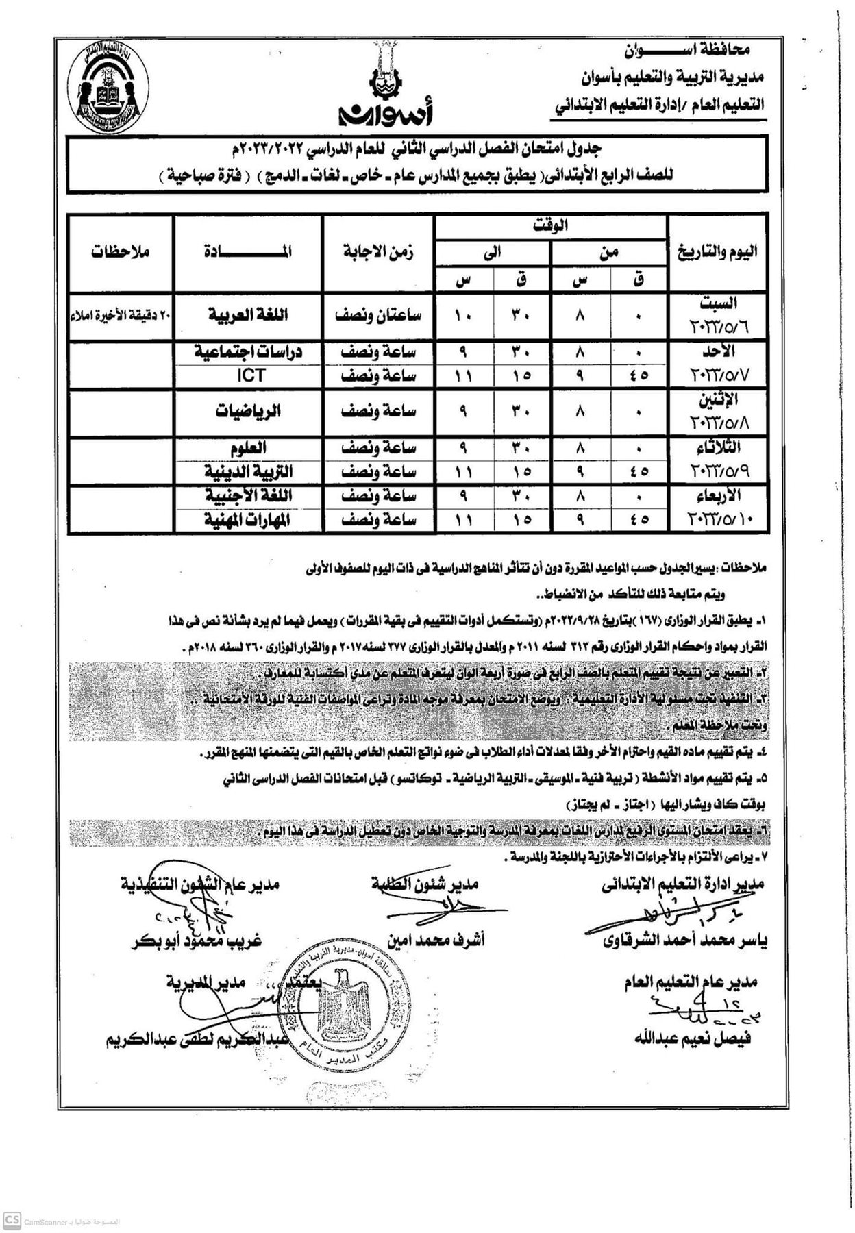 أعلنت مديرية التربية والتعليم بأسوان جداول امتحانات الفصل الدراسى الثانى للصفوف الرابع والخامس والسادس الابتدائى لمدارس الفترة الصباحية والمسائية وللطلاب المتغيبين بعذر عن الفصل الدراسى الأول عام وخاص ولغات ودمج للعام الدراسى 2023/2022.