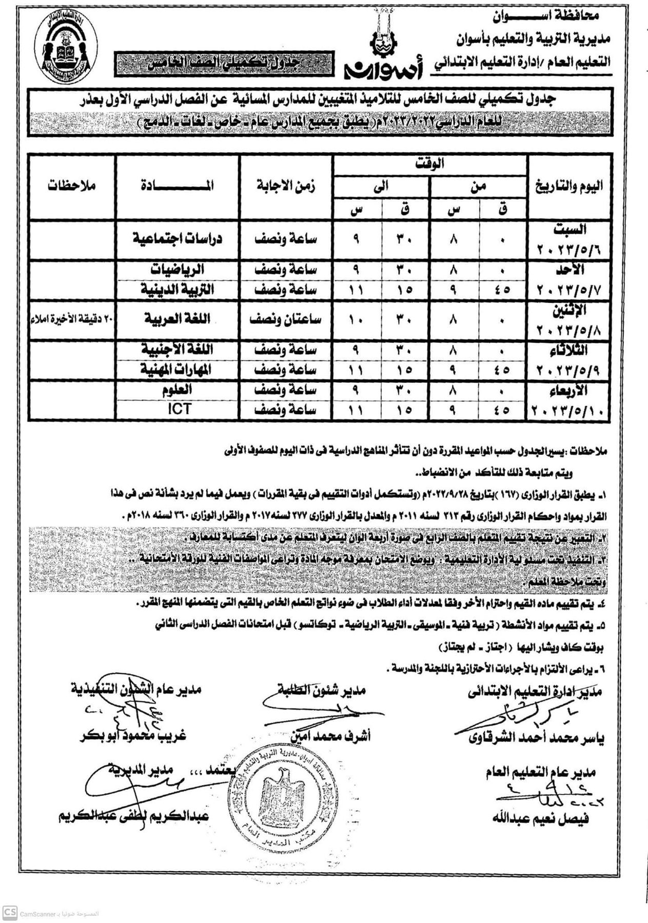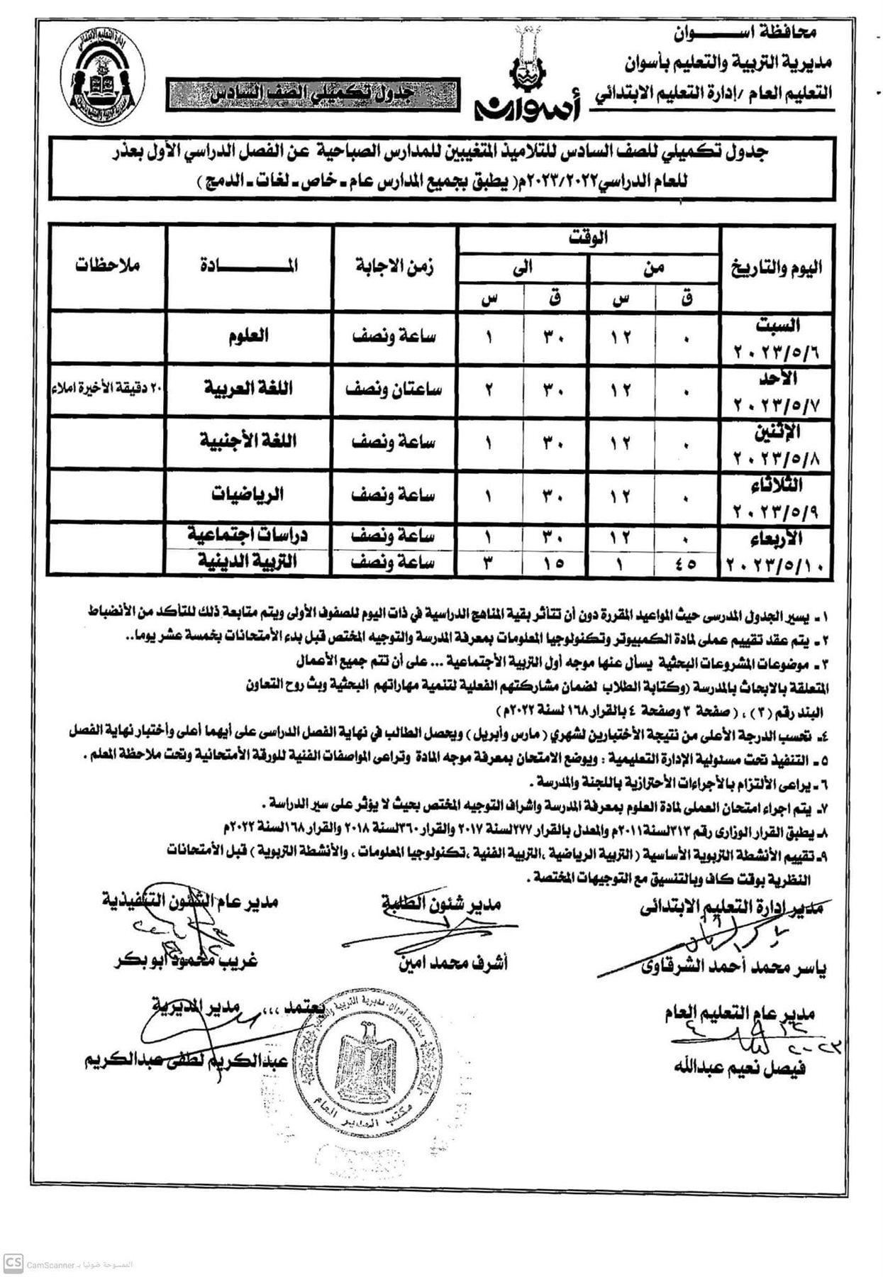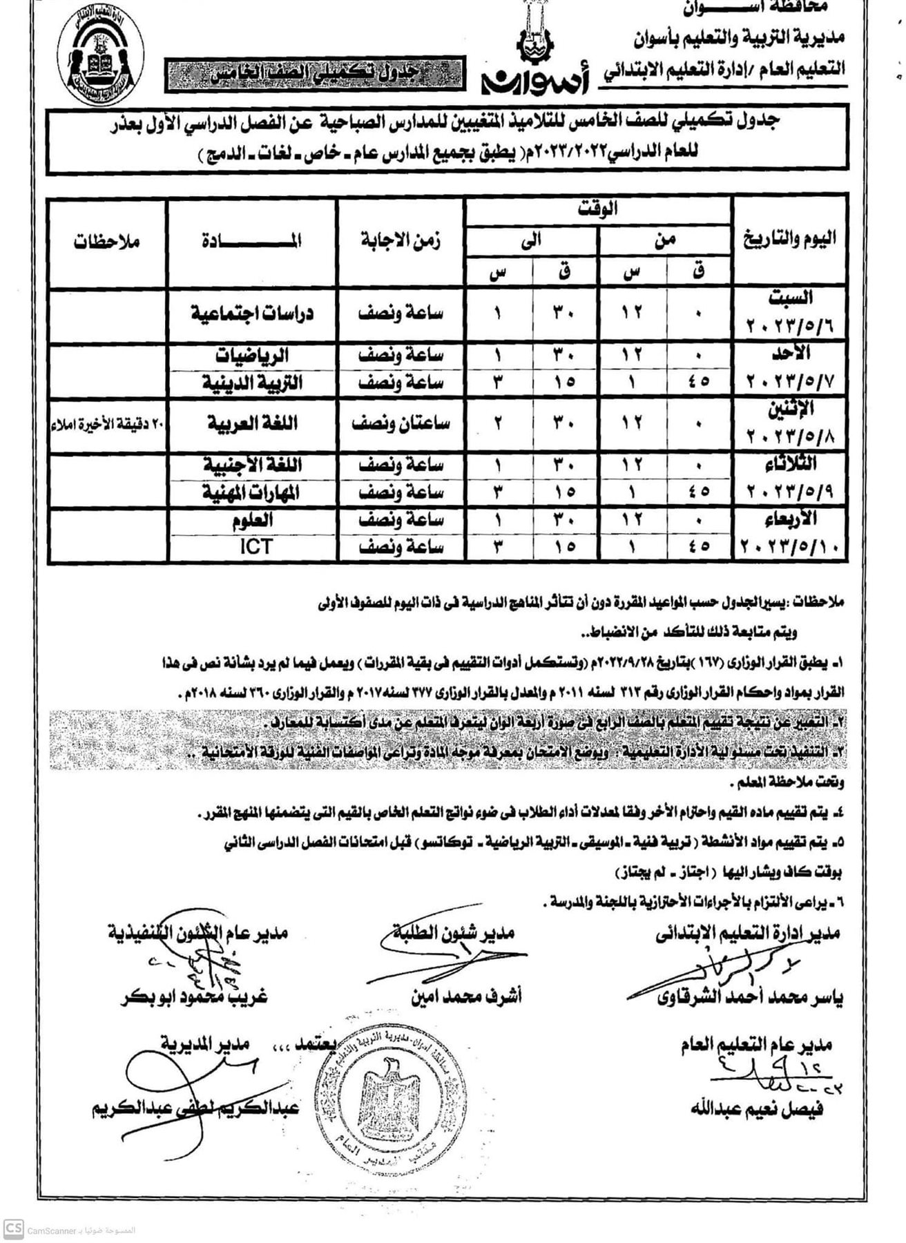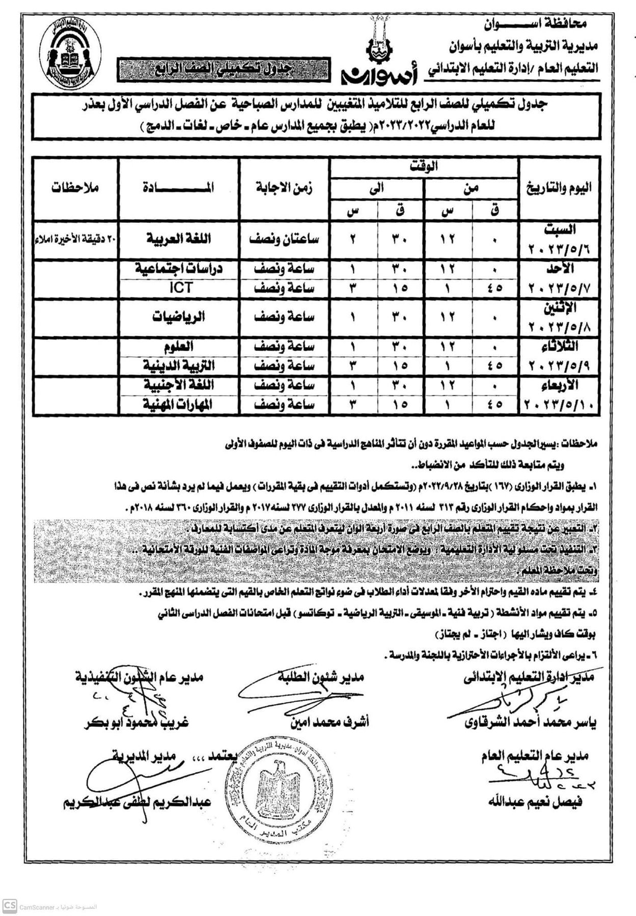 أعلنت مديرية التربية والتعليم بأسوان جداول امتحانات الفصل الدراسى الثانى للصفوف الرابع والخامس والسادس الابتدائى لمدارس الفترة الصباحية والمسائية وللطلاب المتغيبين بعذر عن الفصل الدراسى الأول عام وخاص ولغات ودمج للعام الدراسى 2023/2022.