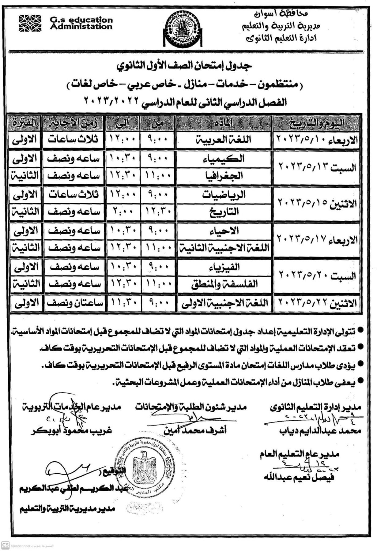 أعلنت مديرية التربية والتعليم بأسوان جداول امتحانات الفصل الدراسى الثانى للصف الأول والثانى الثانوى العام منتظمون وخدمات وخاص لغات وخاص عربى ومنازل للعام الدراسى ٢٠٢٣/٢٠٢٢.