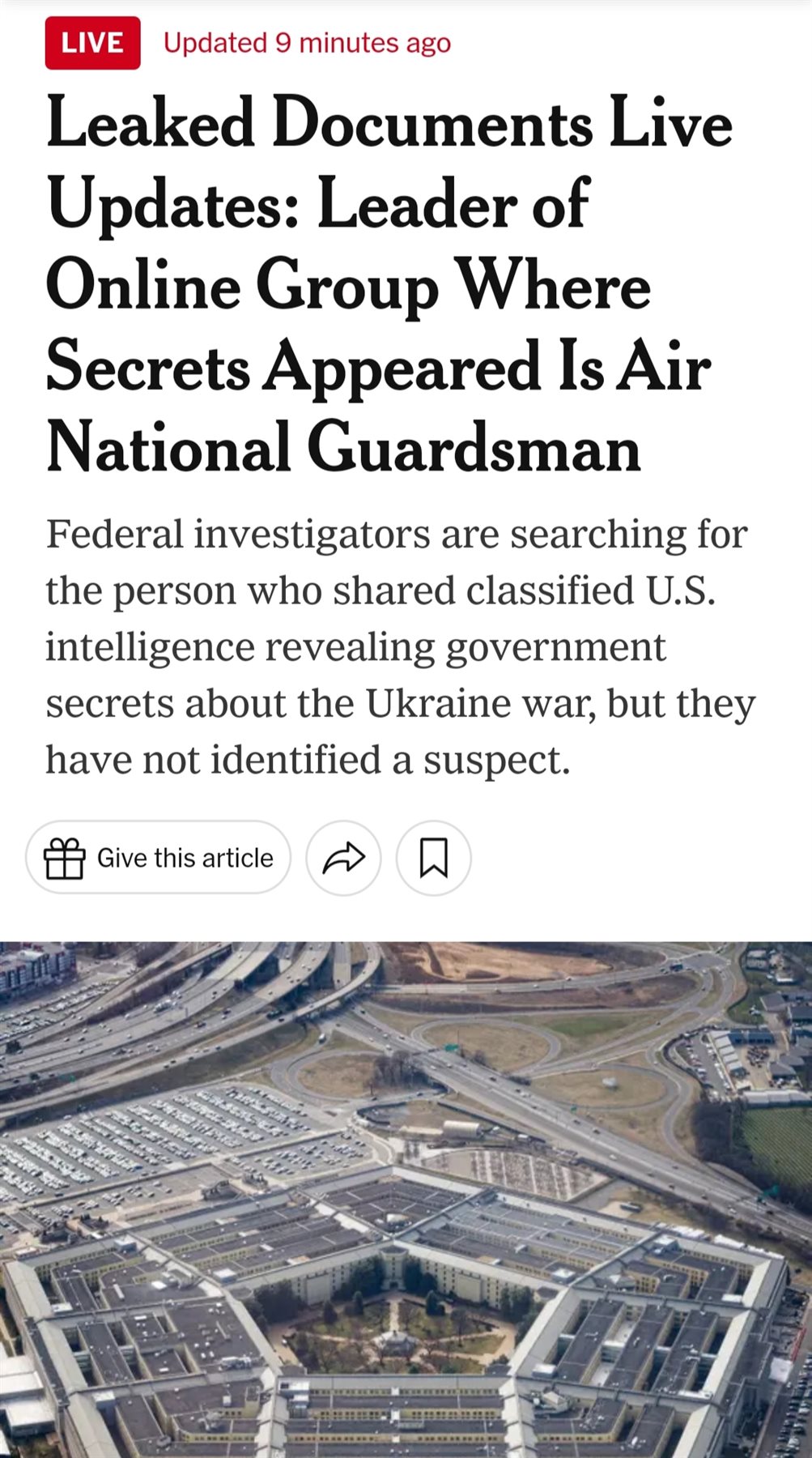 وثائق البنتاجون، أفادت صحيفة «نيويورك تايمز» الأمريكية، بأن مسرب وثائق وزارة الدفاع «البنتاجون» السرية يعمل في الحرس الوطني الجوي الأمريكي في ماساتشوستس.