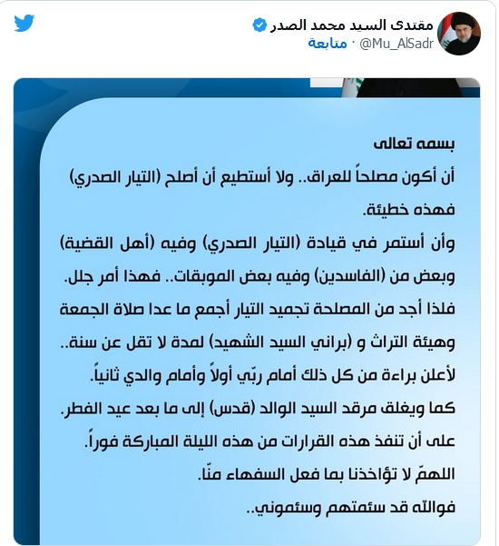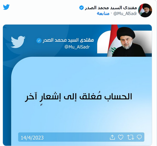وفي تغريدة لاحقة، أعلن الصدر إغلاق حسابه على موقع التواصل الاجتماعي تويتر حتى إشعار آخر.