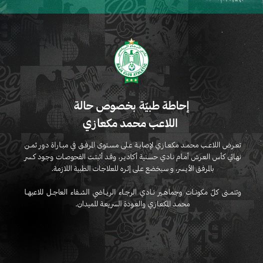 وتتمنى كلّ مكونات وجماهير نادي الرجاء الرياضي الشفاء العاجل للاعبها محمد المكعازي والعودة السريعة للميدان".