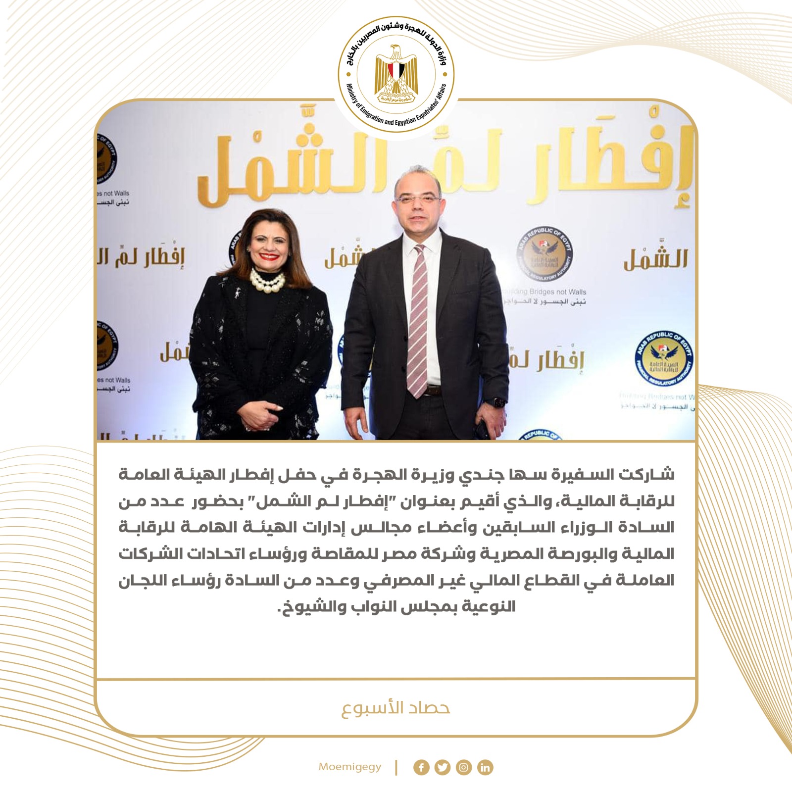 وشاركت السفيرة سها جندي وزيرة الهجرة في حفل إفطار الهيئة العامة للرقابة المالية، والذي أقيم بعنوان "إفطار لم الشمل" بحضور عدد من السادة الوزراء السابقين وأعضاء مجالس إدارات الهيئة الهامة للرقابة المالية والبورصة المصرية وشركة مصر للمقاصة ورؤساء اتحادات الشركات العاملة في القطاع المالي غير المصرفي وعدد من السادة رؤساء اللجان النوعية بمجلس النواب والشيوخ.