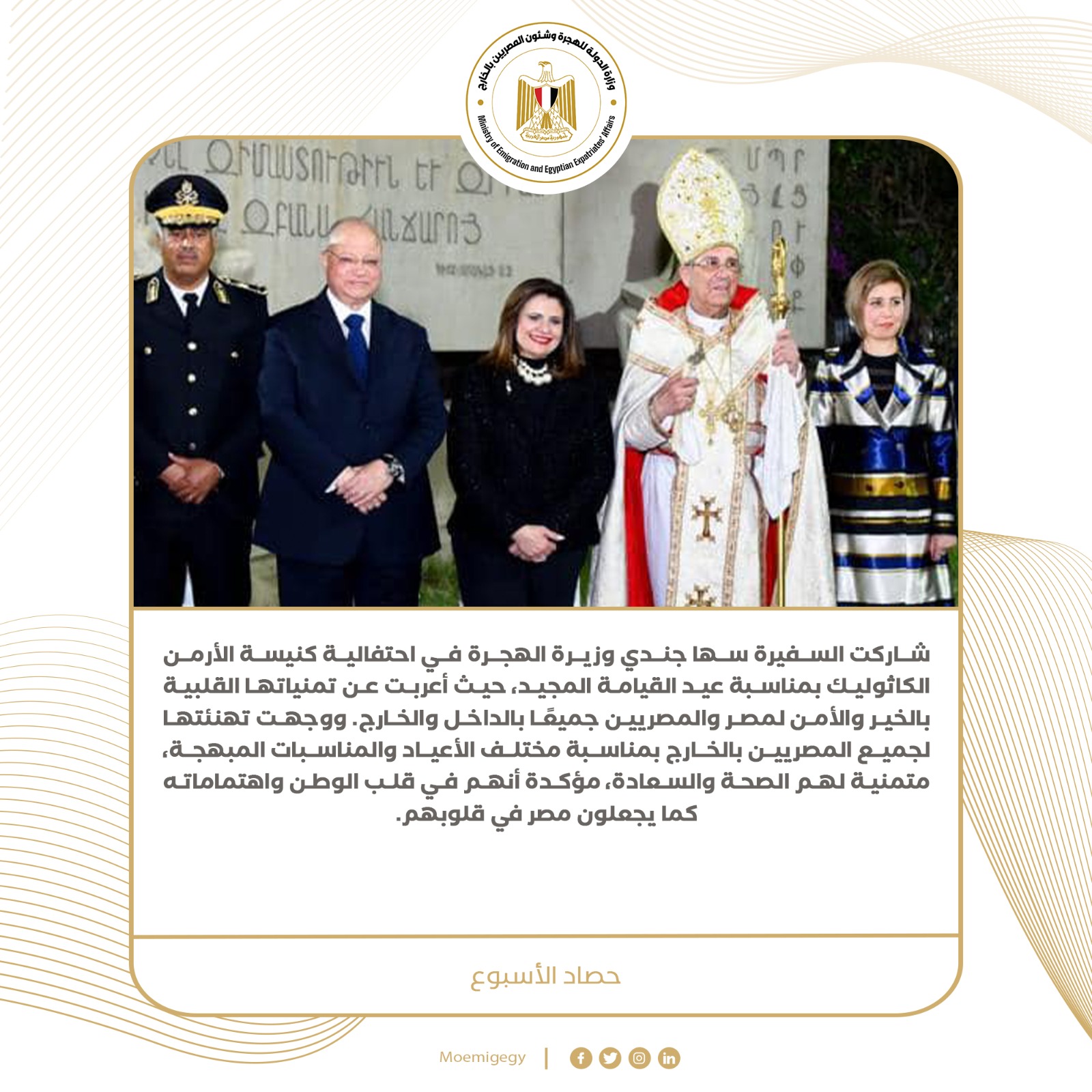 وشاركت السفيرة سها جندي وزيرة الهجرة في احتفالية كنيسة الأرمن الكاثوليك بمناسبة عيد القيامة المجيد، حيث أعربت عن تمنياتها القلبية بالخير والأمن لمصر والمصريين جميعًا بالداخل والخارج. ووجهت تهنئتها لجميع المصريين بالخارج بمناسبة مختلف الأعياد والمناسبات المبهجة، متمنية لهم الصحة والسعادة، مؤكدة أنهم في قلب الوطن واهتماماته كما يجعلون مصر في قلوبهم.