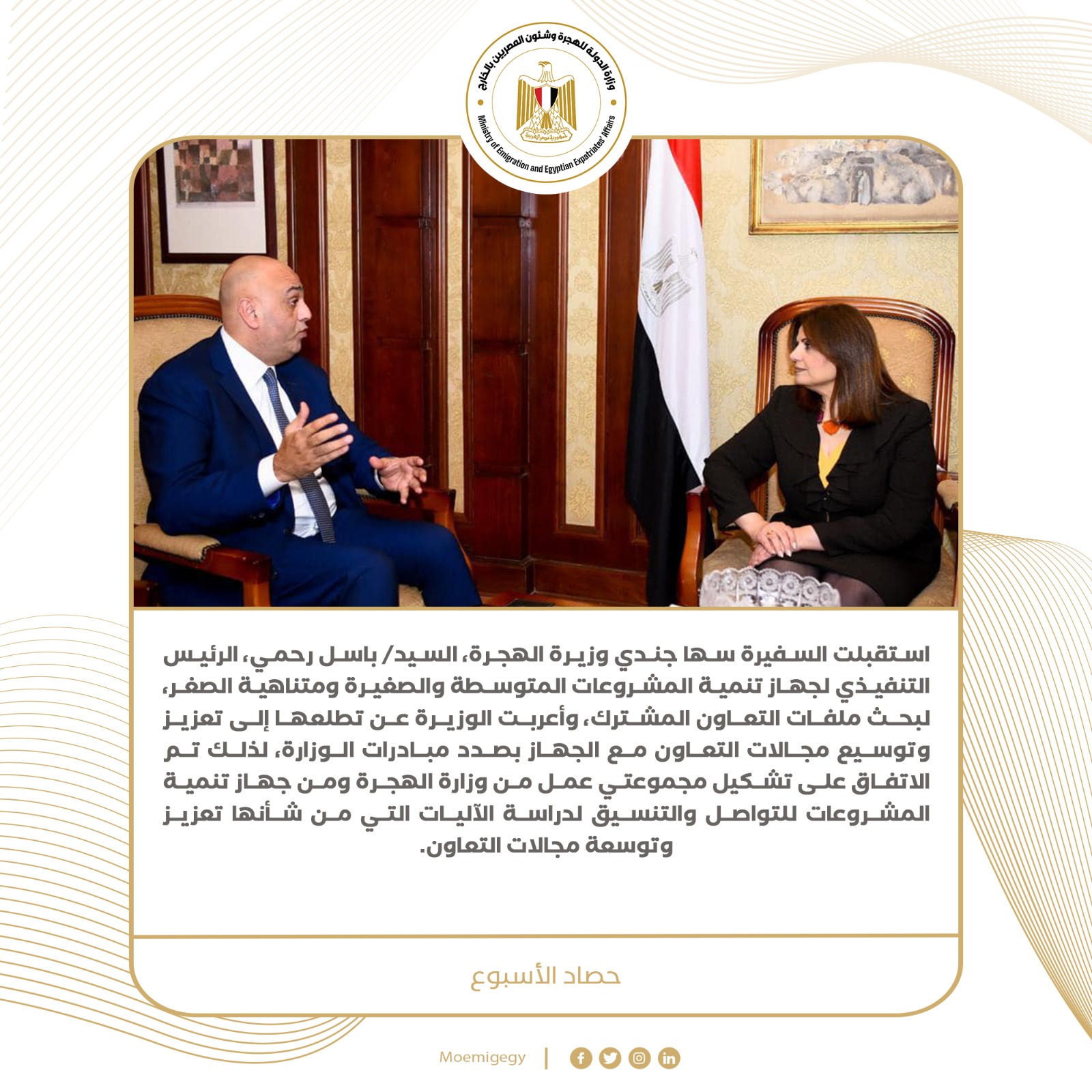 نشرت وزارة الدولة للهجرة وشئون المصريين بالخارج، تقريرًا تسلط من خلاله الضوء على نشاط هذا الأسبوع للسفيرة سها جندي وزيرة الهجرة، وذلك خلال الفترة من 8 أبريل إلى 14 أبريل وهو كالآتي: