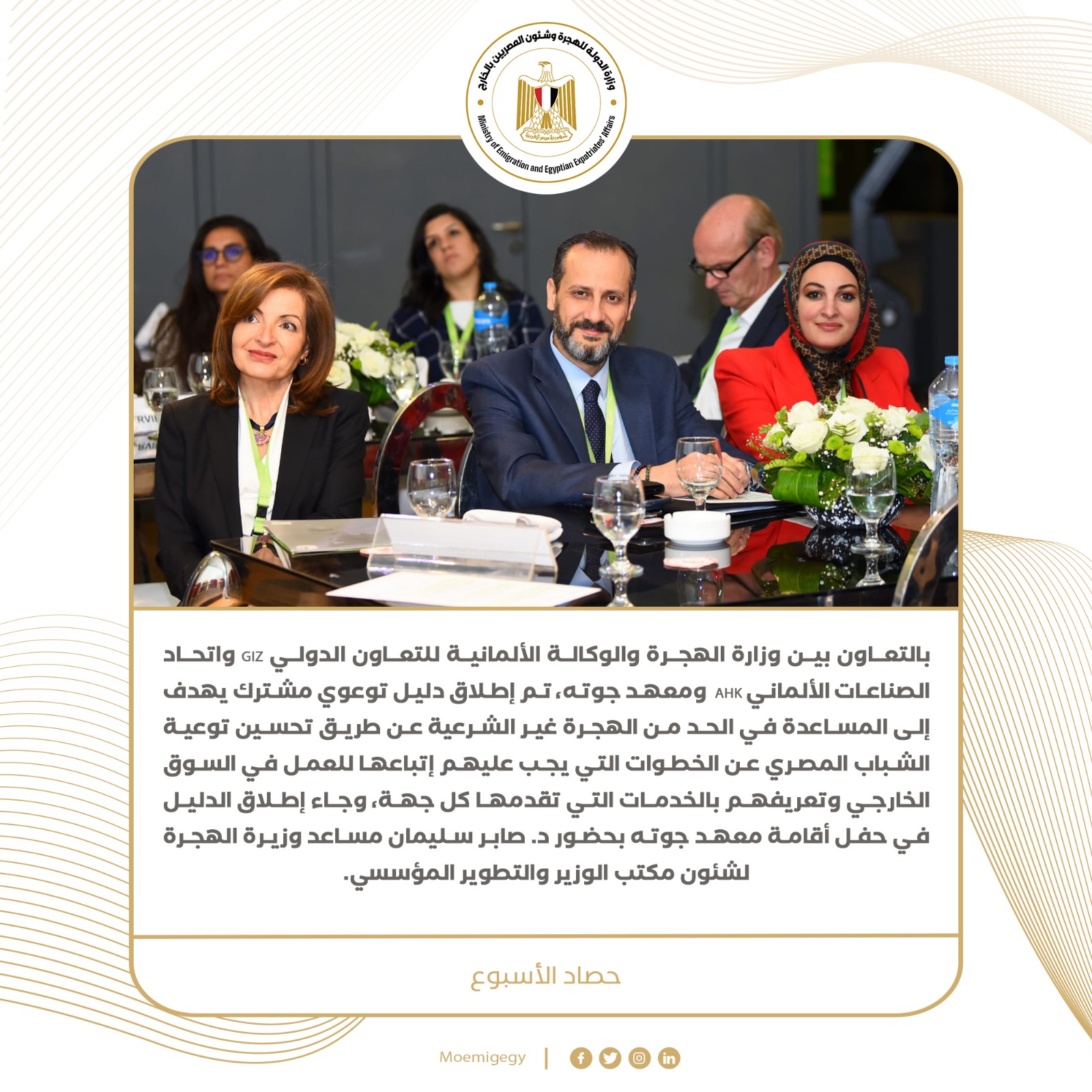 و بالتعاون بين وزارة الهجرة والوكالة الألمانية للتعاون الدولي GIZ واتحاد الصناعات الألماني AHK ومعهد جوته، تم إطلاق دليل توعوي مشترك يهدف إلى المساعدة في الحد من الهجرة غير الشرعية عن طريق تحسين توعية الشباب المصري عن الخطوات التي يجب عليهم اتباعها للعمل في السوق الخارجي وتعريفهم بالخدمات التي تقدمها كل جهة، وجاء إطلاق الدليل في حفل أقامه معهد جوته بحضور د. صابر سليمان مساعد وزيرة الهجرة لشئون مكتب الوزير والتطوير المؤسسي.