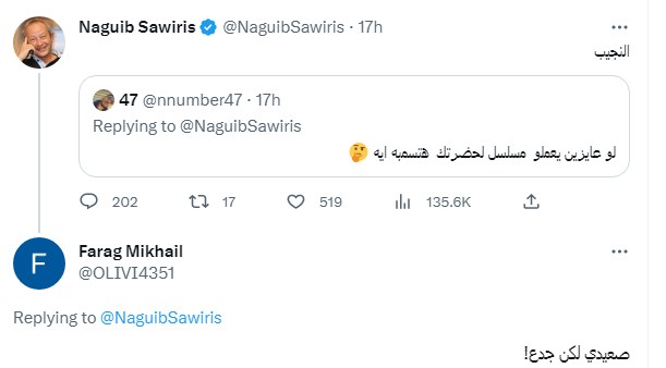 رد نجيب ساويرس جاء بعد أن وجه إليه أحد متابعيه رسالة قال فيها: «لو عايزين يعملوا مسلسل لحضرتك هتسميه إيه»