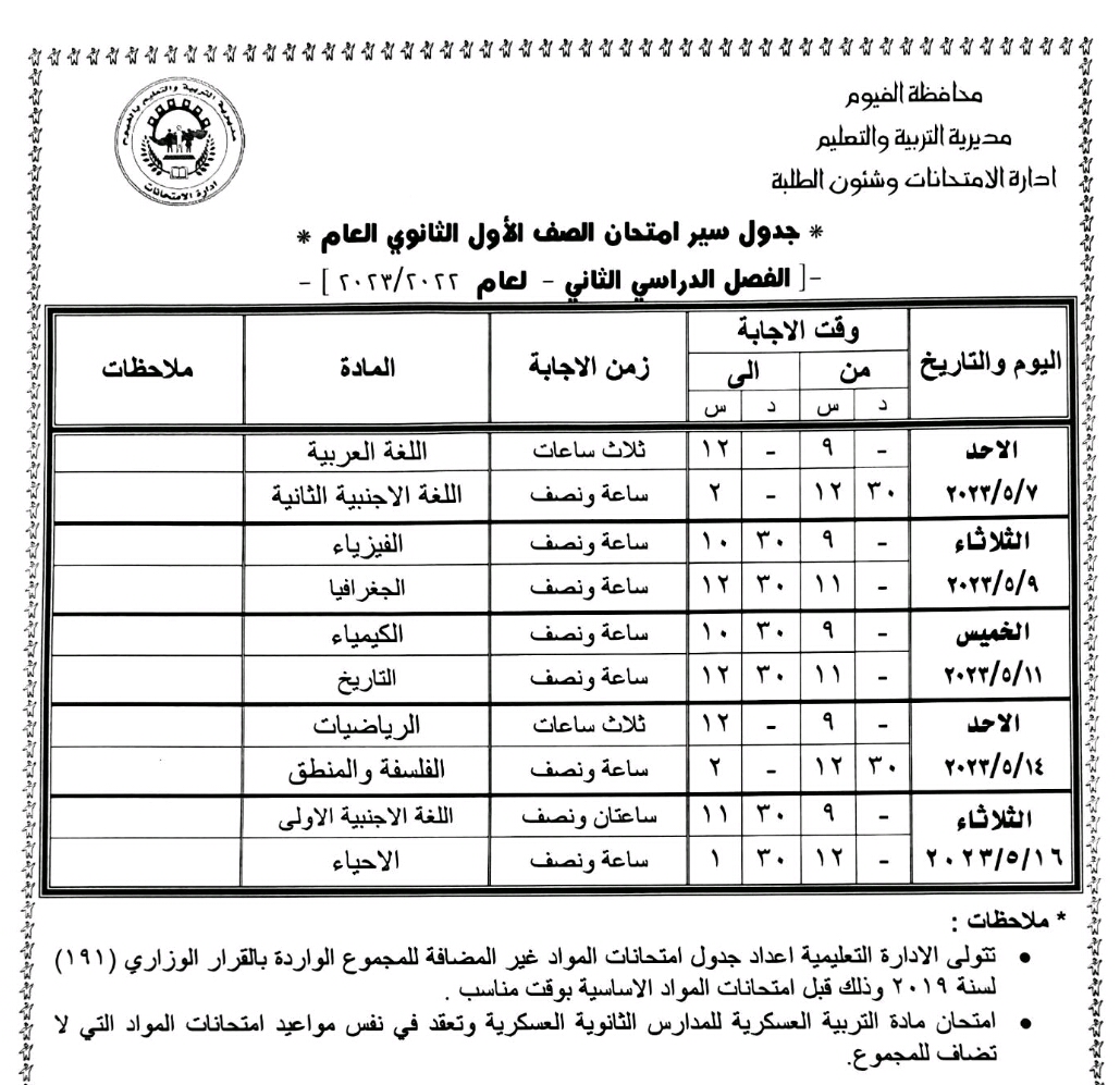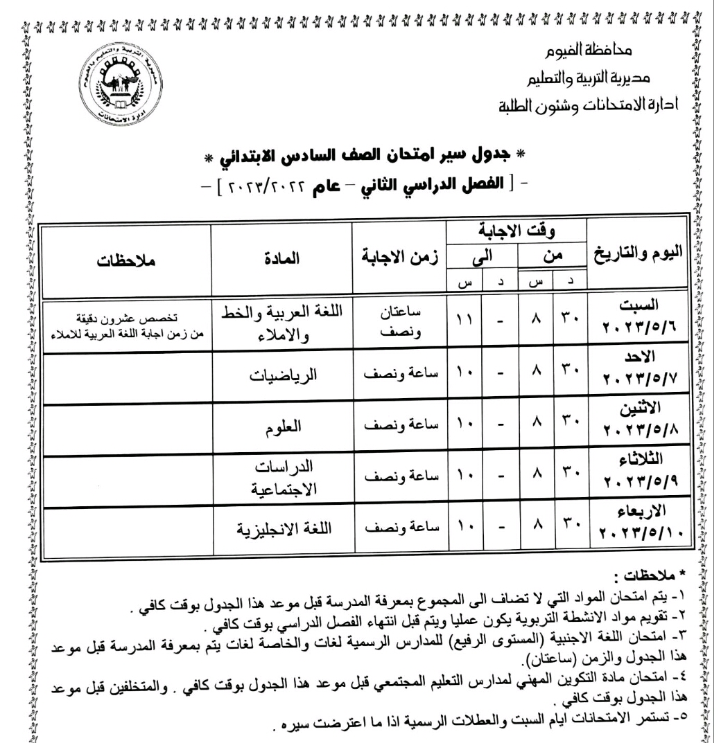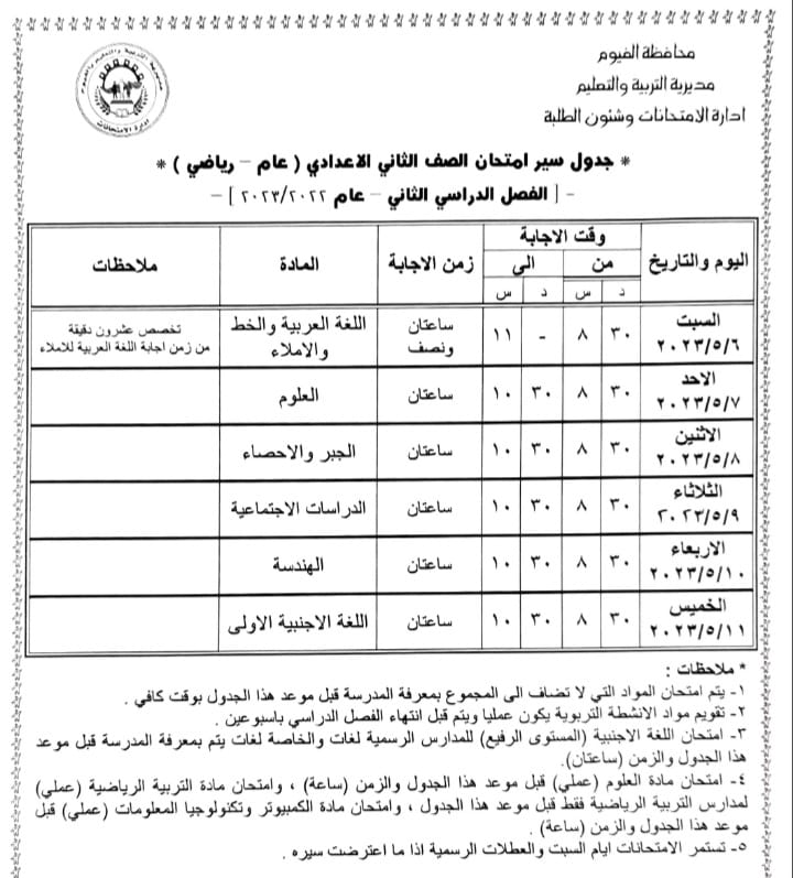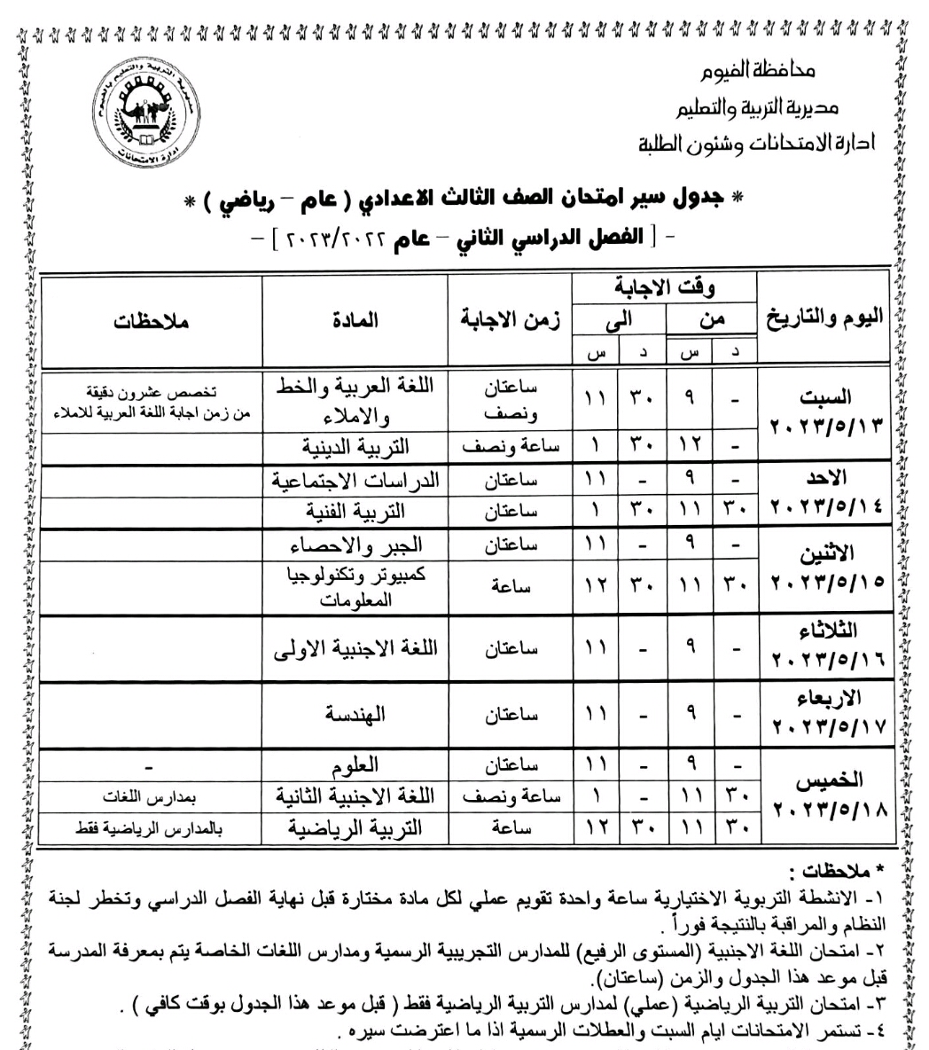 محافظ الفيوم يعتمد جداول امتحانات الفصل الدراسي الثاني لصفوف النقل والشهادة الإعدادية