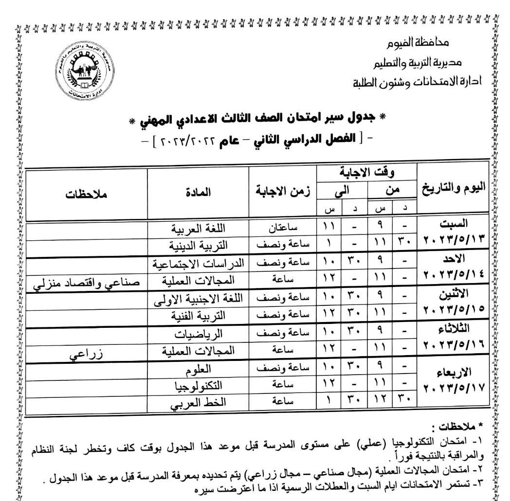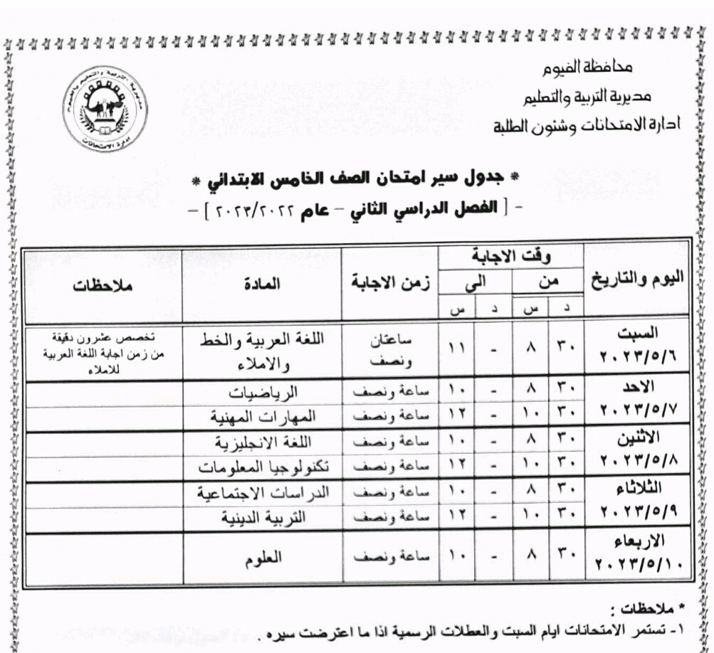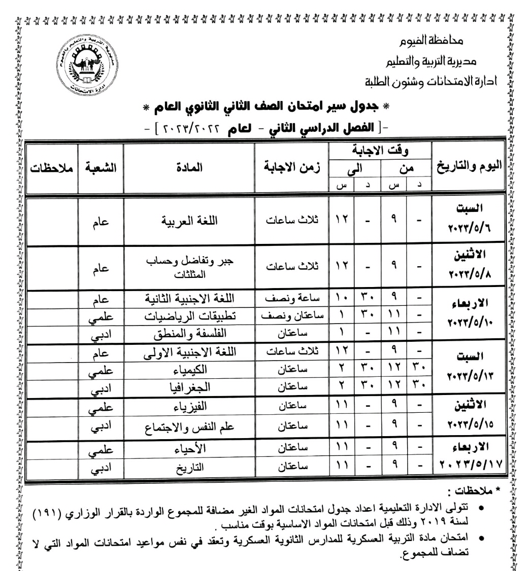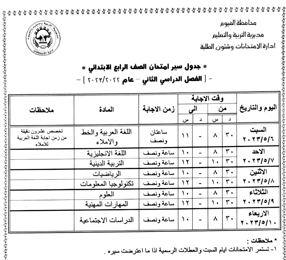 محافظ الفيوم يعتمد جداول امتحانات الفصل الدراسي الثاني لصفوف النقل والشهادة الإعدادية