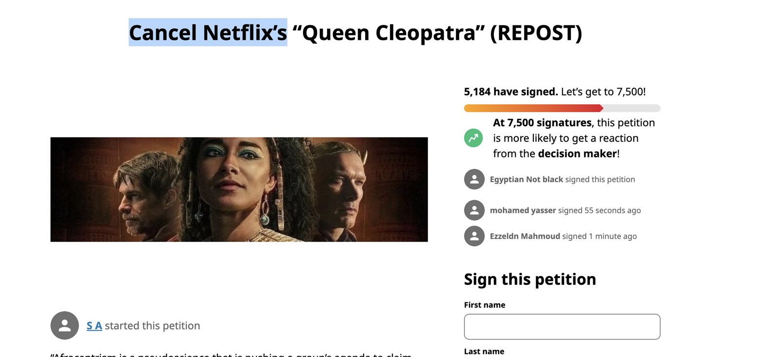 Queen Cleopatra، في خطوة غريبة ومفاجئة حذف موقع Change.org، الصفحة الخاصة بالتوقيع على عريضة المطالبة بإلغاء عرض فيلم الملكة كليوباترا السمراء، المقرر عرضه علي منصة نتفليكس الشهر المقبل، بسبب تزويره للتاريخ.