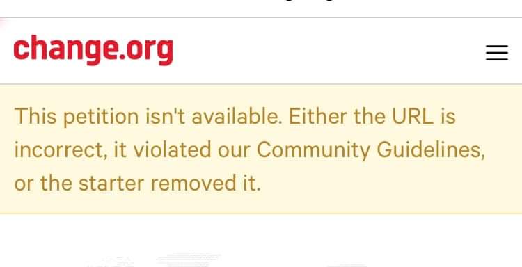 وحذف الموقع صفحة عريضة التوقيع بعد كسرها حاجز الـ١٥٠ ألف توقيع من عدة دول حول العالم.