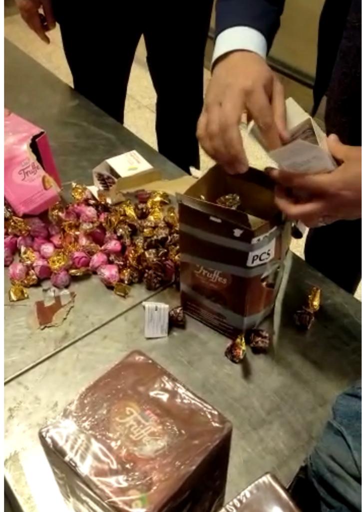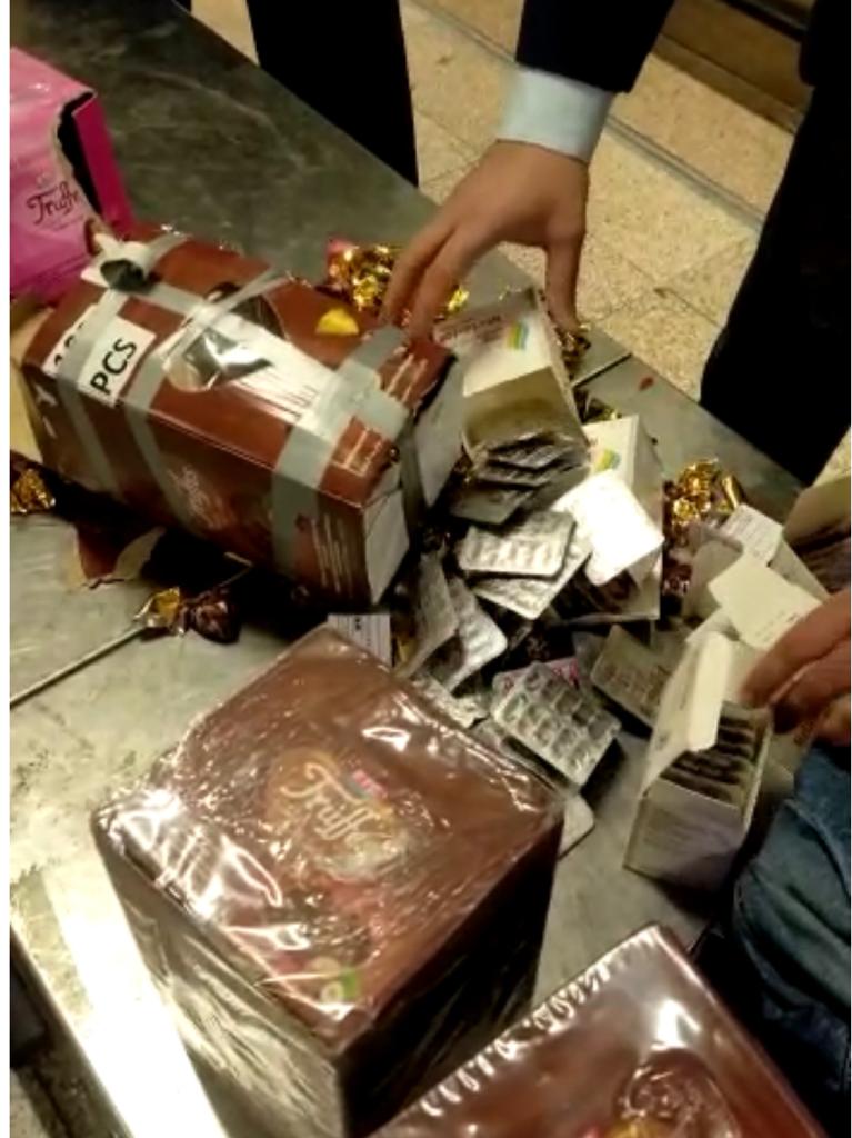 وبتفتيش حقائبه علي جهاز الفحص بالأشعة بواسطة كل من علاء فتحي مأمور الجمرك وأحمد الشريف رئيس القسم واللذان تلاحظ لهما وجود شرائط دوائية داخل حقائب الراكب، قام خالد شعبان مدير الحركة المشرف على صالة الوصول بمبني الركاب رقم ٣ بتكليف احمد مرسي محمد مأمور الجمرك بتفتيش حقائب الراكب يدويا مما اسفر عن ضبط ٨١ شريط لعقار الترامادول المخدر باجمالي ٨١٠ قرص اخفاهم الراكب داخل علبة شيكولاتة كرتونية.