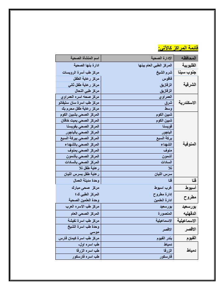 كشفت وزارة الصحة عن قائمة بأهم المراكز التي تجري فحوصات المقبلين على الزواج خلال أيام عيد الفطر المبارك.