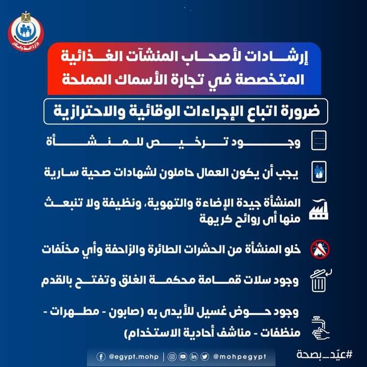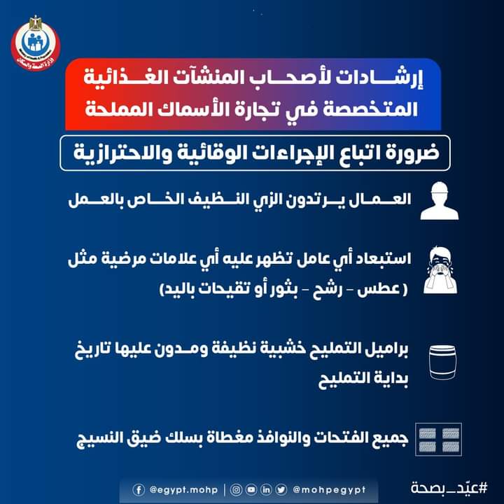 وجهت وزارة الصحة تعليمات لأصحاب المنشآت الغذائية التي تبيع الأسماك المملحة، في موسم شم النسيم سواء الفسيخ أو الرنجة
