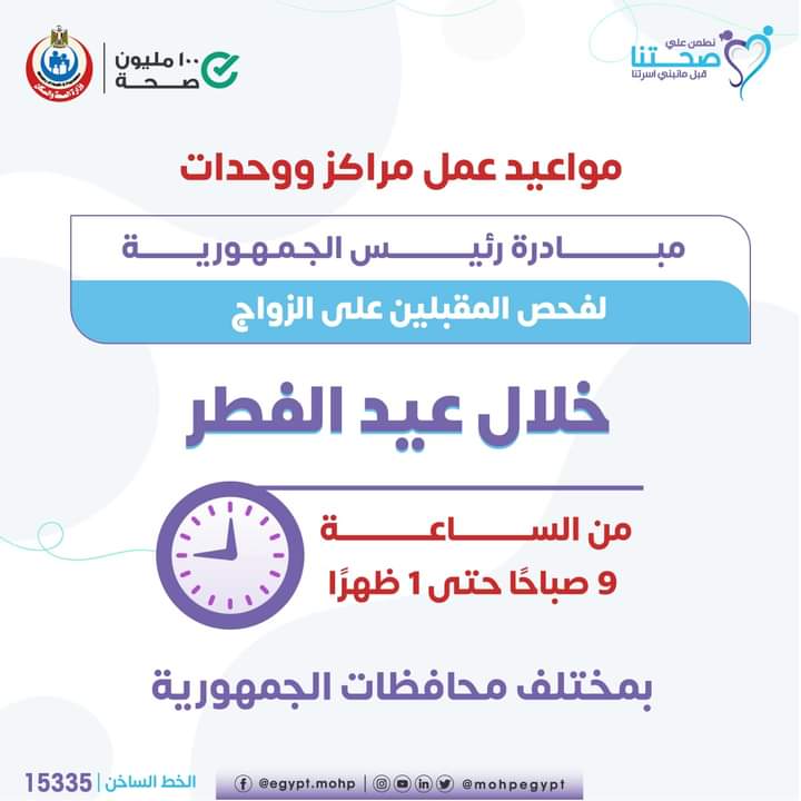 كشفت وزارة الصحة عن مواعيد عمل وحدات الصحة المخصصة لإجراء فحوصات المقبلين على الزواج خلال أيام العيد الفطر المبارك.