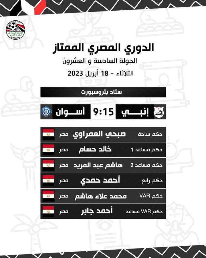 الدوري المصري، أعلنت لجنة الحكام الرئيسية باتحاد الكرة المصري، أسماء حكام مباراتي اليوم الثلاثاء ضمن مواجهات الجولة 26 من الدوري المصري الممتاز، وجاءت على النحو التالي: