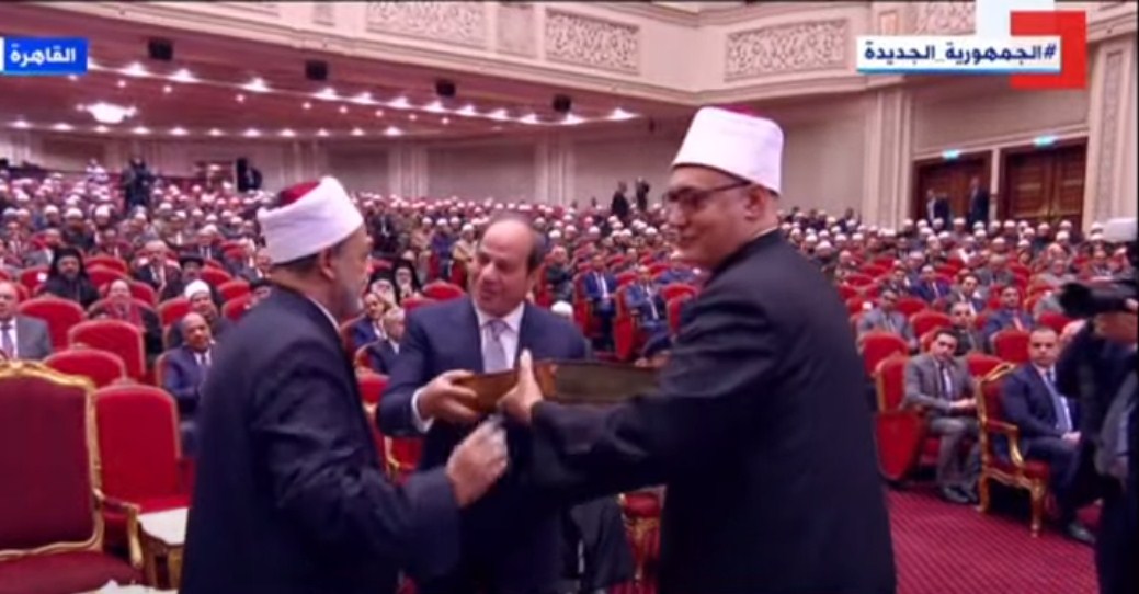 أهدى فضيلة الأمام الأكبر شيخ الأزهر الشريف، الرئيس السيسي هدية تذكارية خلال حفل وزارة الأوقاف بليلة القدر