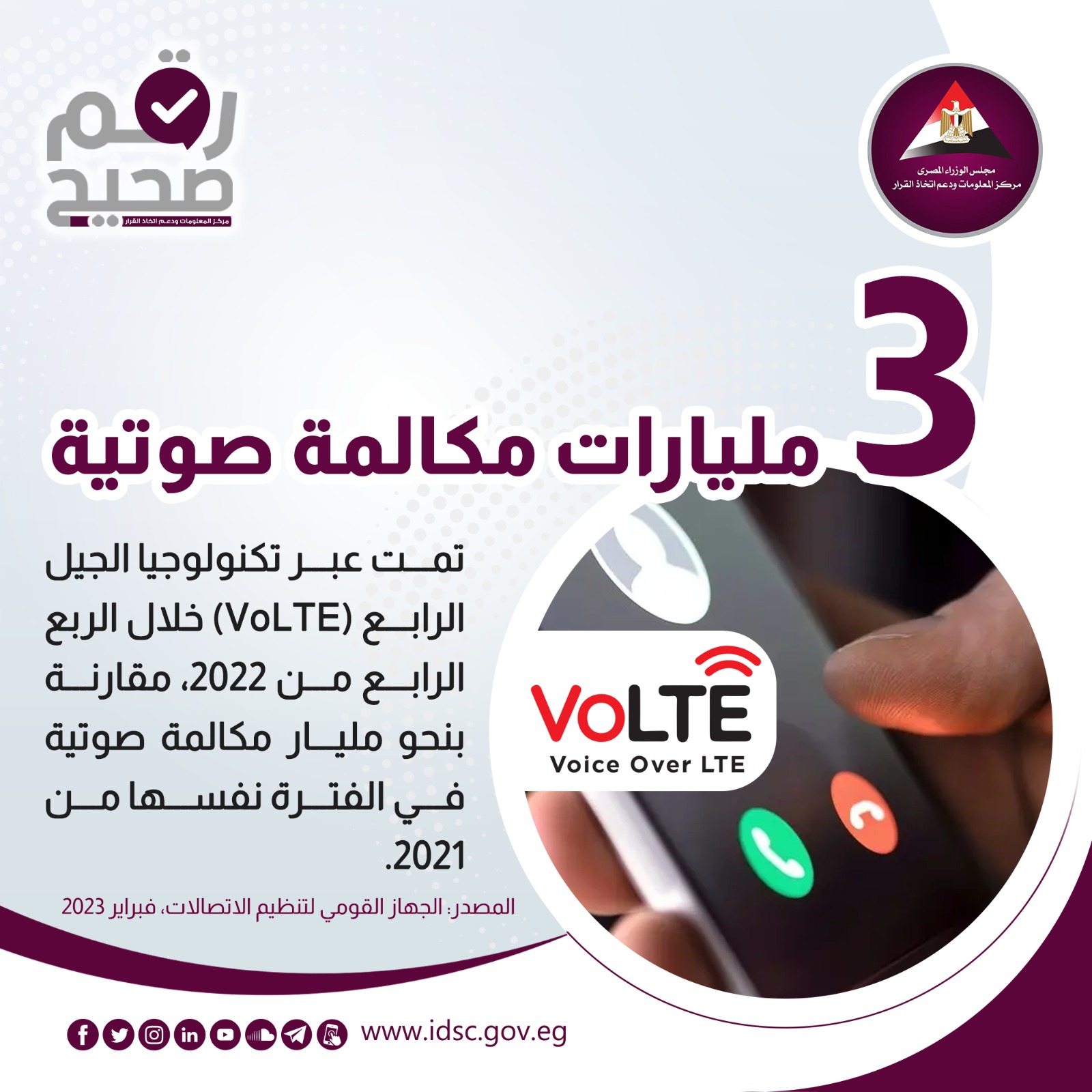 ووفقًا لبيانات الجهاز القومي لتنظيم الاتصالات - مصر، تم إجراء نحو 3 مليارات مكالمة صوتية عبر تكنولوجيا الجيل الرابع (VoLTE) خلال الربع الرابع من 2022 مقارنة بمليار مكالمة خلال الفترة نفسها من 2021، أي بنسبة زيادة قدرها 200%.