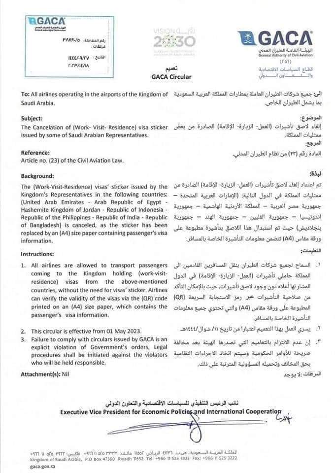 وقالت الهيئة العامة للطيران المدني السعودي في خطابها الي شركات الطيران العاملة بمطارات المملكة العربية السعودية بما فيها شركات الطيران الخاصة، بإلغاء لاصق تأشيرات العمل والزيارة والإقامة الصادرة من بعض ممثليات المملكة.