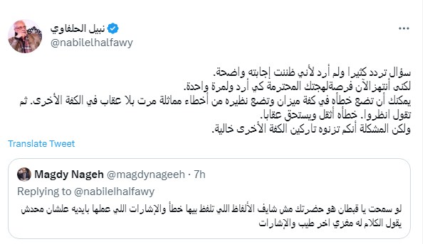 وعن كهربا، أكد نبيل الحلفاوي أنه للحكم على خطأ لاعب الأهلي كهربا فيجب أن يتم وضع خطأه في كفة ميزان مع أخطاء نظيره، لمعرفة ما إذا كان خطأ كهربا أثقل ويستحق العقاب.