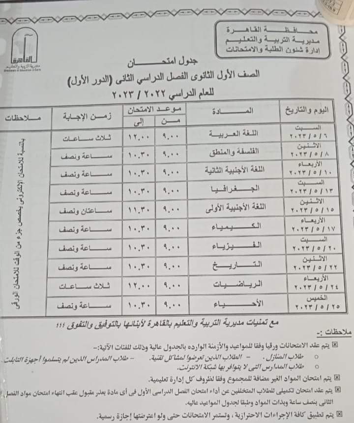 جدول امتحانات نهاية العام للصفين الأول والثاني الثانوي بالقاهرة