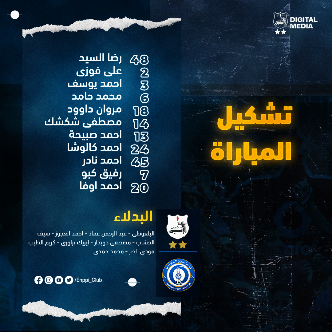 ويتواجد على مقاعد البدلاء كل من، عبد العزيز البلعوطي وعبد الرحمن عماد وأحمد العجوز ومصطفى دويدار وسيف الخشاب ومحمد حمدي ومودي ناصر وإيريك تراوري وكريم الطيب.