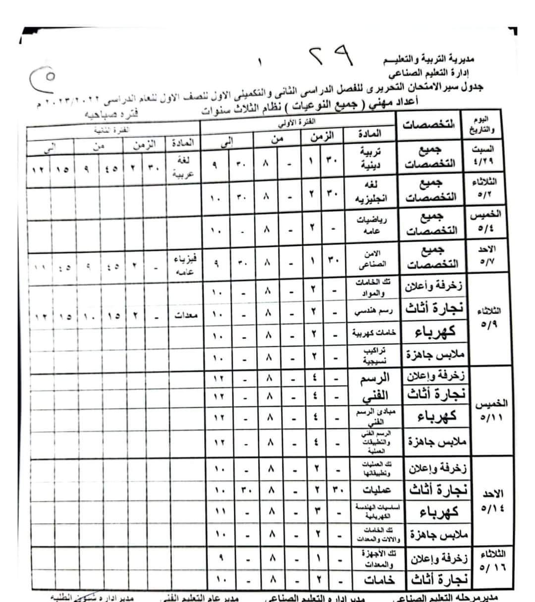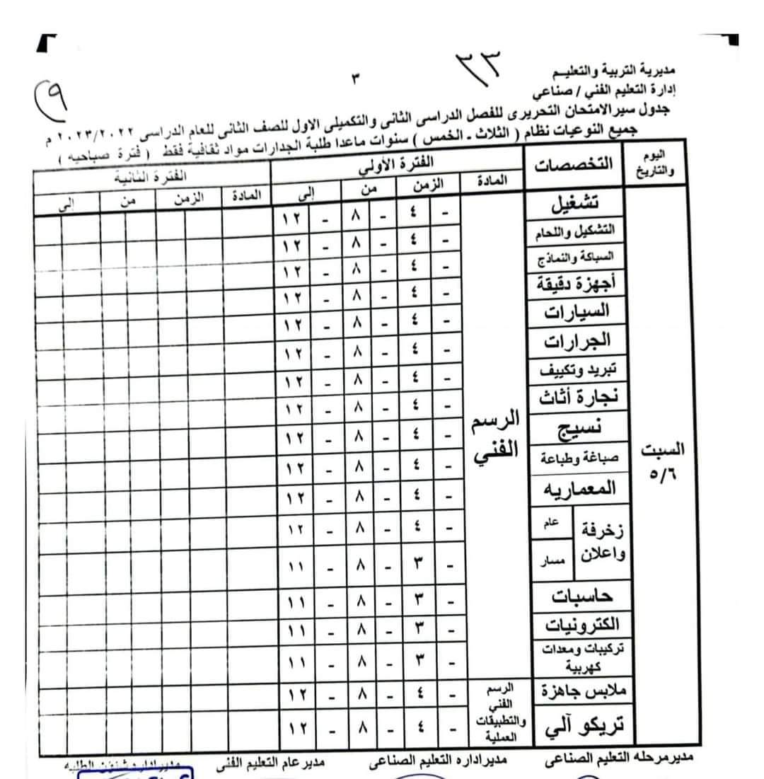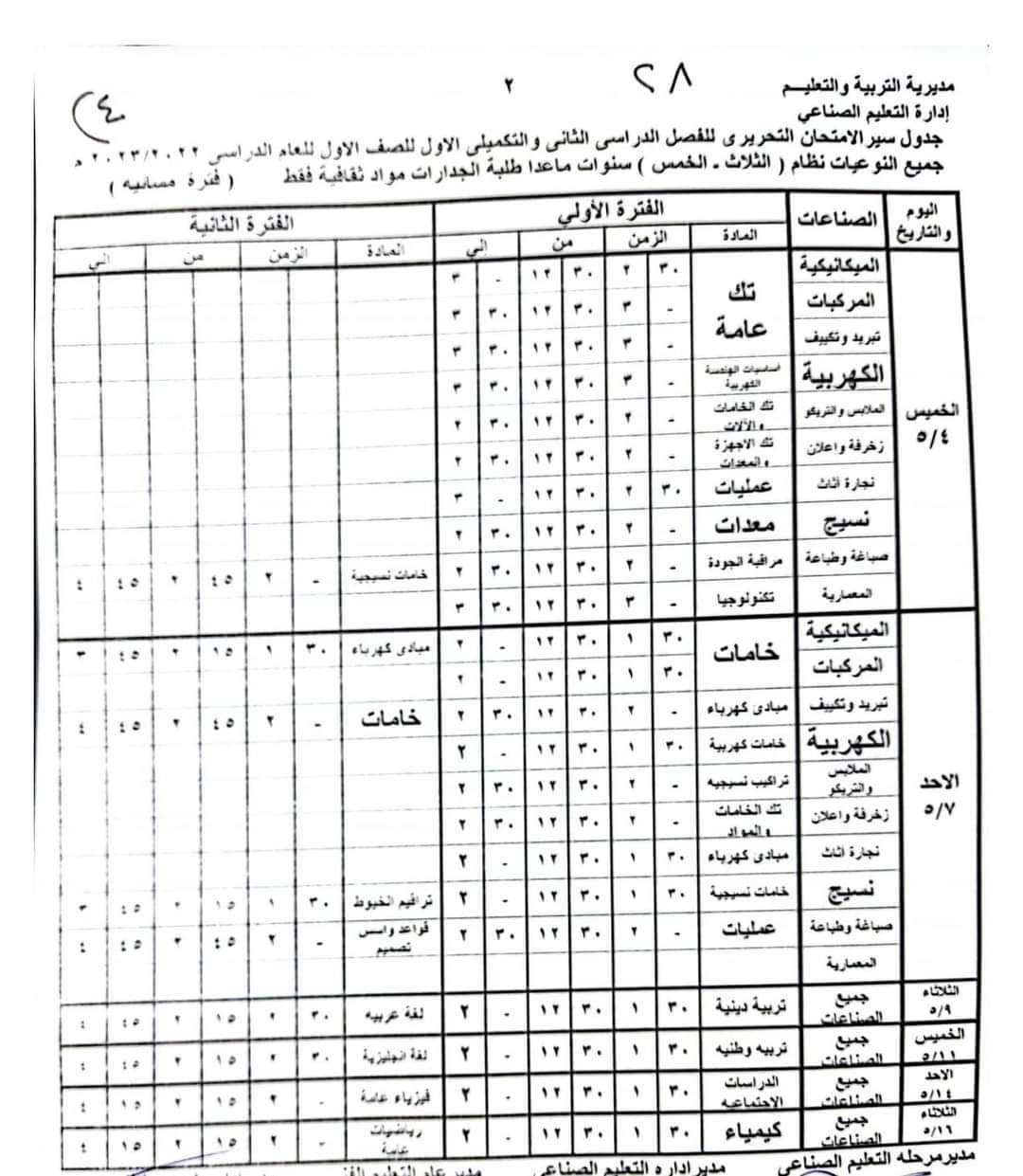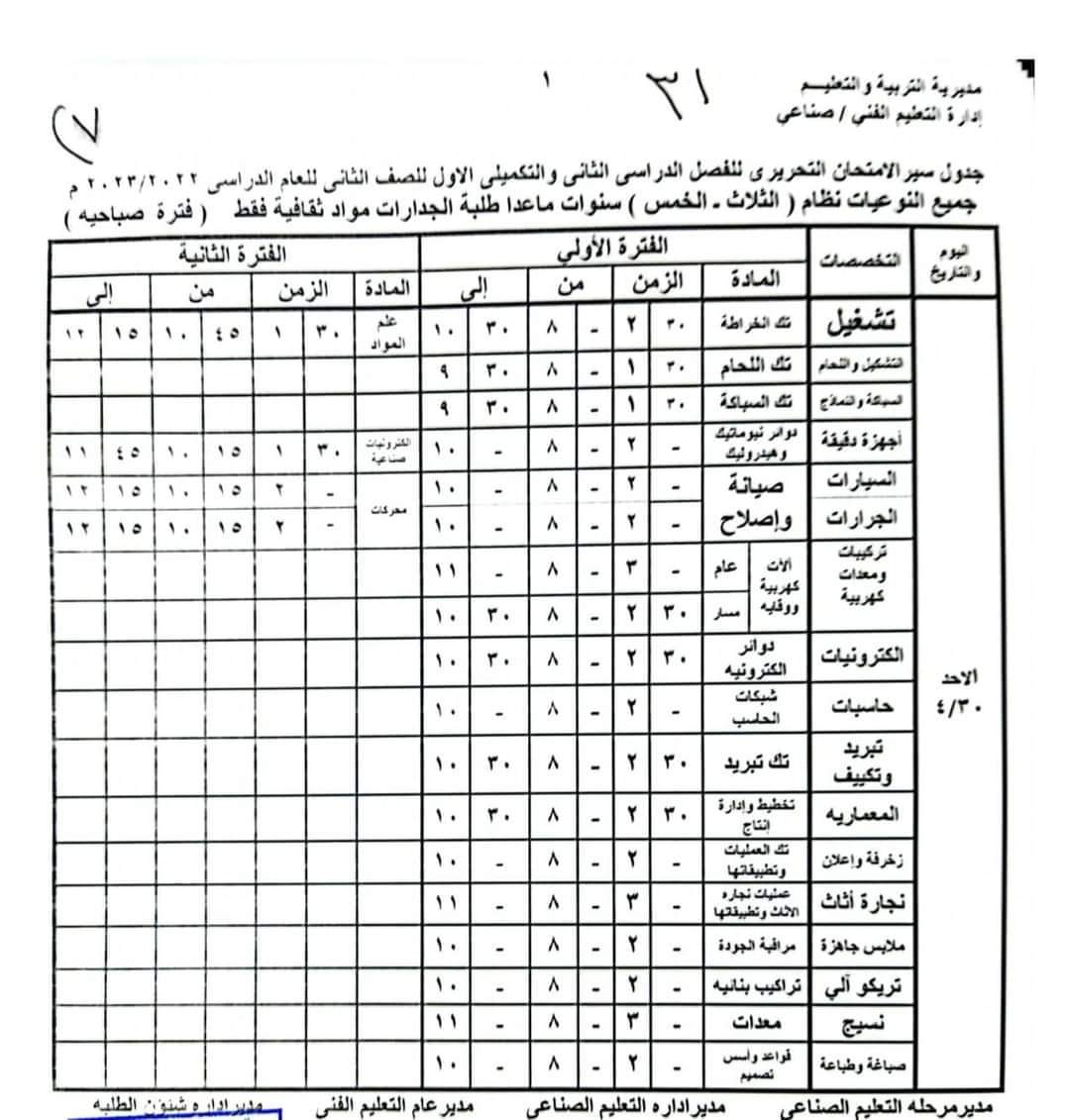 ننشر فيتو جداول امتحانات الصفين الأول والثاني الثانوي الصناعى نظام الثلاث والخمس سنوات، الفصل الدراسي الثاني للعام الدراسي ٢٠٢٢/ ٢٠٢٣ نظام الثلاث والخمس سنوات، بمحافظة المنيا