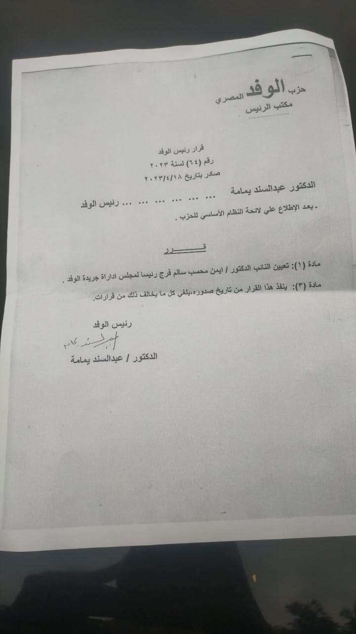 حزب الوفد، أصدر الدكتور عبد السند يمامة رئيس الوفد قرارا بتكليف الدكتور أيمن محسب نائب رئيس الهيئة البرلمانية لحزب الوفد بمجلس النواب وعضو الهيئة العليا برئاسة مجلس إدارة جريدة الوفد وبوابتها الإلكترونية.