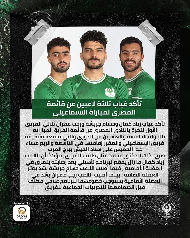 كشف النادي المصري عن تفاصيل إصابة اللاعبين زياد كمال وحسام جريشة ورجب عمران ثلاثي الفريق الأول للكرة بالنادي المصري عن قائمة الفريق لمباراته بالجولة الخامسة والعشرين من الدوري والتي تجمعه وفريق الإسماعيلي المقرر إقامتها في التاسعة والربع مساء غدا الخميس على ستاد الجيش ببرج العرب.