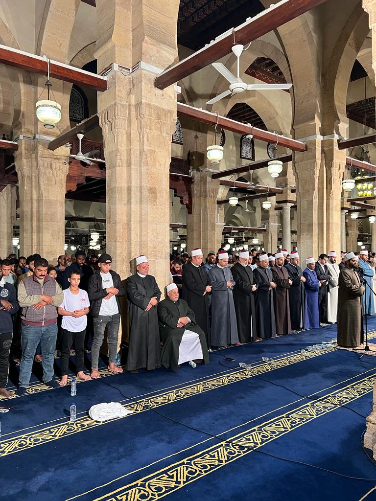 وتقدم المصلين الدكتور محمد الضويني وكيل الأزهر، ونخبة من علماء وقيادات الأزهر الشريف، وأقيمت صلاتا العشاء والتراويح بسور الطارق والأعلى والغاشية والفجر والبلد والشمس والليل والضحى والشرح والتين والعلق والقدر والبينة والزلزلة والعاديات والقارعة والتكاثر والعصر والهمزة والفيل وقريش والماعون والكوثر والكافرون والنصر والمسد والإخلاص والفلق والناس، براوية ورش عن نافع المدني، وخلف عن حمزة الكوفي، وأبو حارث عن الكسائي، وقالون عن نافع المدني.