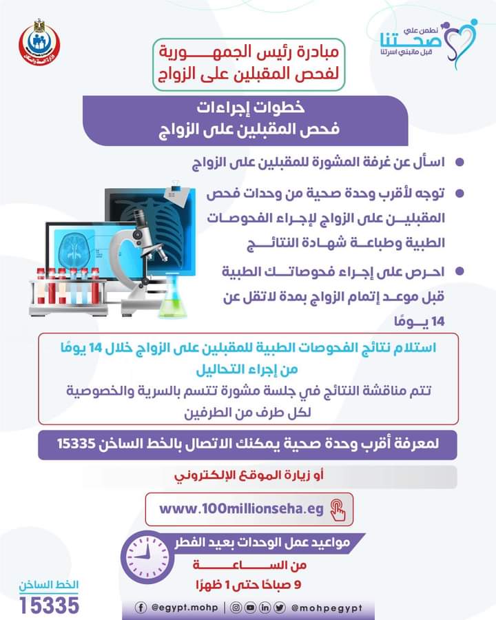 يذكر أنه يتم الرد على الاستفسارات الخاصة بمبادرة فحص المقبلين على الزواج من خلال الخط الساخن 15335، أو زيارة الموقع الإلكتروني أو من خلال صفحات الوزارة الرسمية على منصات وسائل التواصل الاجتماعي (فيسبوك، تويتر، انستجرام، يوتيوب، لينكدإن).