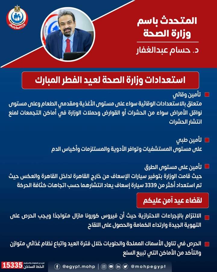 كشف الدكتور حسام عبدالغفار المتحدث باسم وزارة الصحة عن أهم استعدادات وزارة الصحة لعيد الفطر المبارك حيث تم وضع خطة للتأمين الطبي منها تأمين وقائي متعلق بالاستعدادات الوقائية سواء على مستوى الأغذية ومقدمي الطعام وعلى مستوى نواقل الأمراض سواء من الحشرات أو القوارض وحملات الوزارة في أماكن التجمعات لمنع انتشار الحشرات.