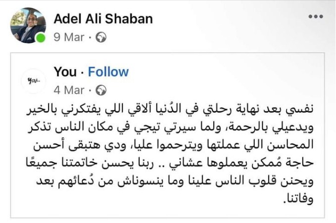 عادل شعبان، "نفسي بعد نهاية رحلتي في الدنيا ألاقي اللي يفتكرني بالخير ويدعيلي بالرحمة..." كانت هذه آخر كلمات مهندس البرمجيات المصري العالمي عادل شعبان، الذي توفي أمس الأربعاء بعد صراع طويل مع المرض.