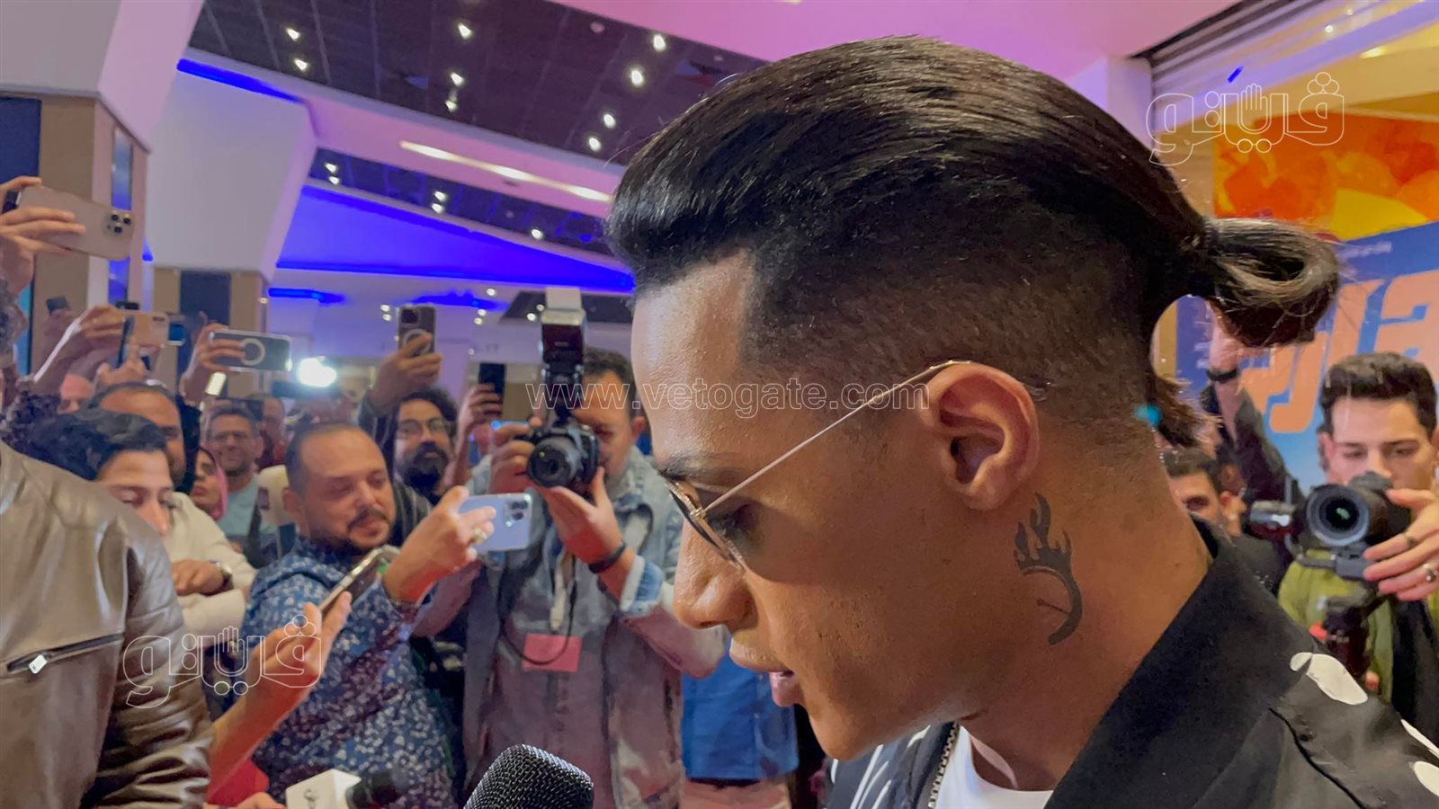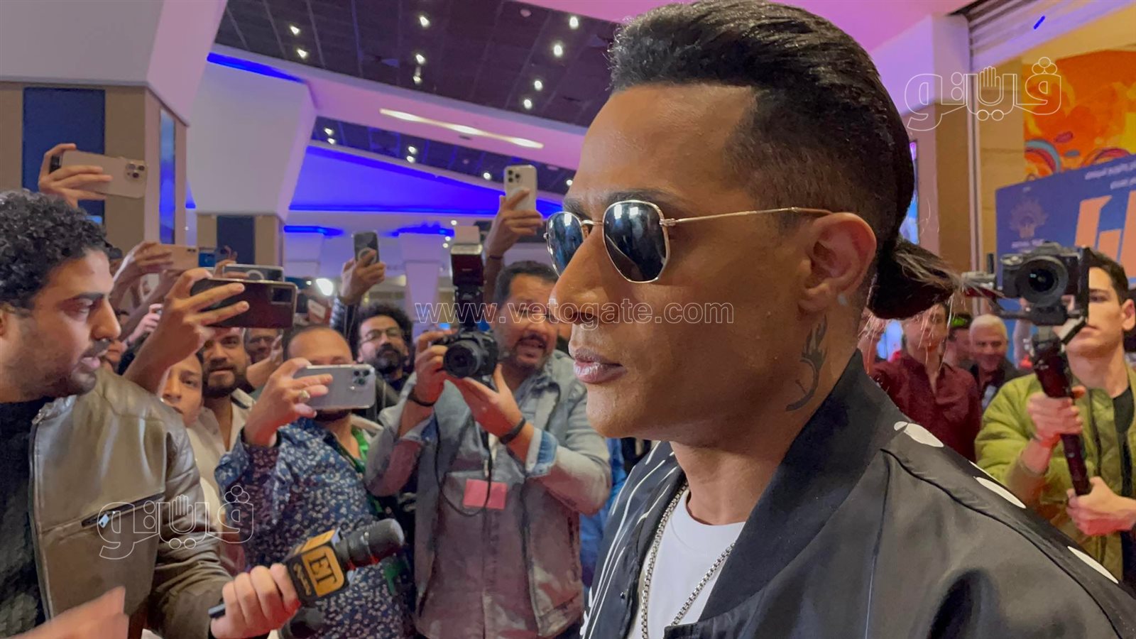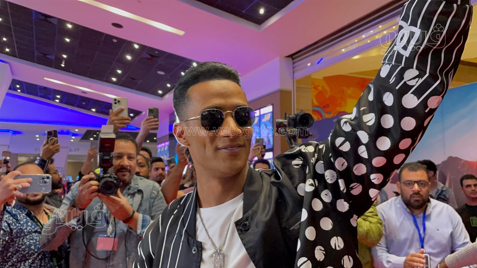 وبمجرد وصوله أحاط محمد رمضان بجمهوره ومعجبيه وسط استقبال حار وحفاوة كبيرة.