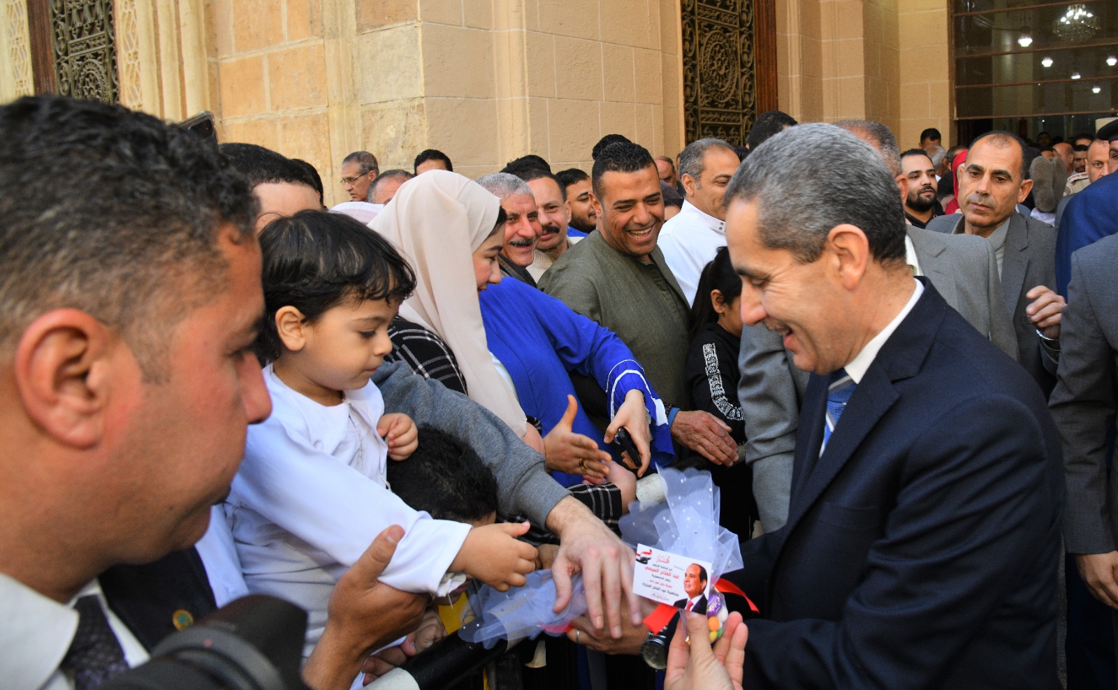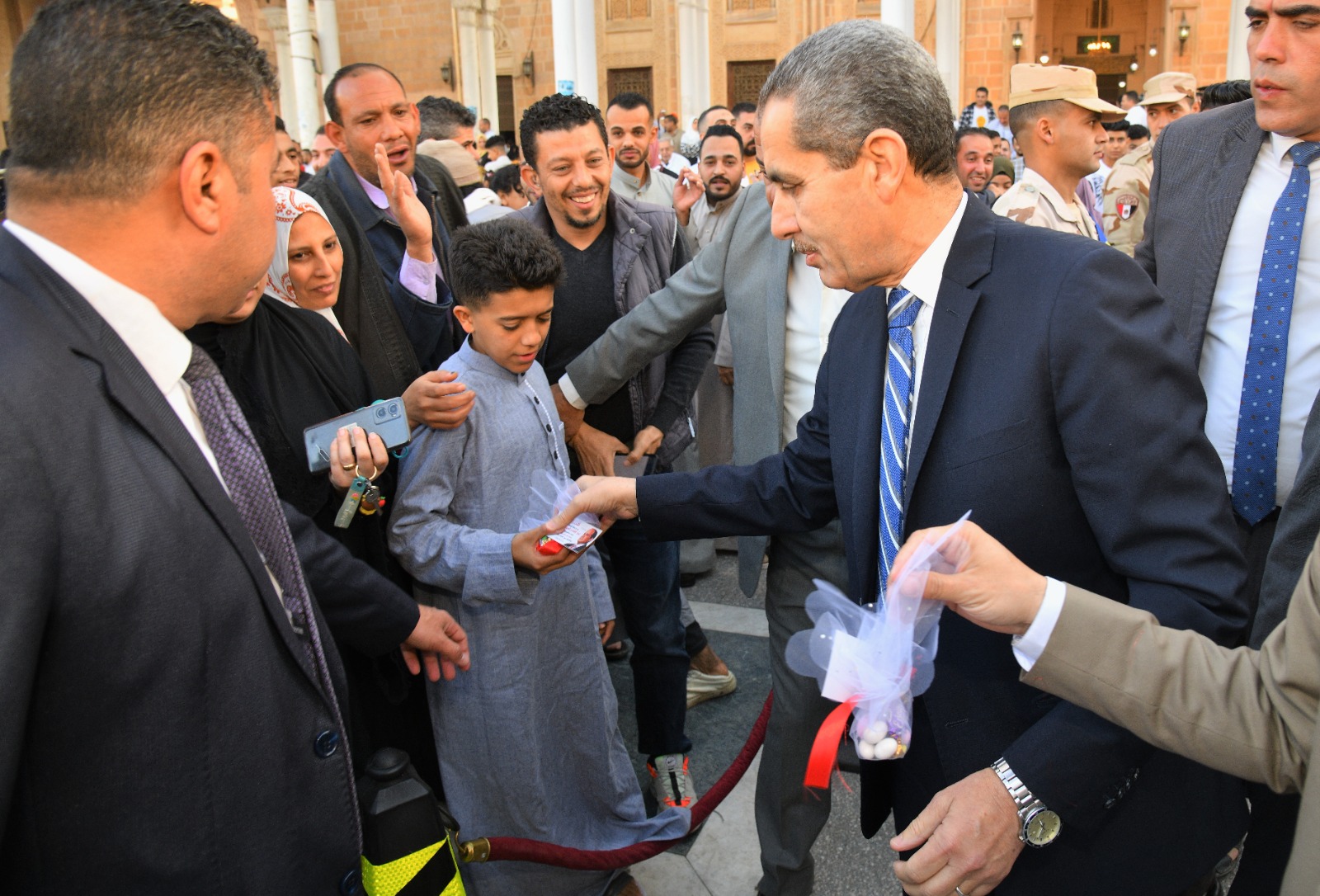 وسادت حالة من البهجة بعد أداء صلاة عيد الفطر في ساحات المسجد، حيث قام المحافظ بتوزيع الهدايا، وعليها صورة الرئيس عبد الفتاح السيسي، على المصلين من الأطفال والكبار، وقدم محافظ الغربية التهنئة للأمة الإسلامية وشعب مصر عامة وأهالي الغربية خاصة بمناسبة حلول العيد، داعيًا المولى-عز وجل- أن يحفظ مصر وشعبها، وأن يديم عليها نعمة الأمن والاستقرار، ويعيد هذه المناسبة بالخير واليمن والبركات تحت قيادة فخامة الرئيس عبد الفتاح السيسي رئيس الجمهورية.