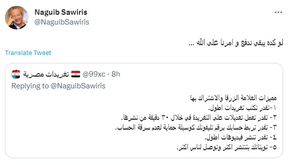 وعلق مهندس نجيب ساويرس على مميزات العلامة الزرقاء على تويتر قائلًا: " لو كده يبقى ندفع وأمرنا على الله …"