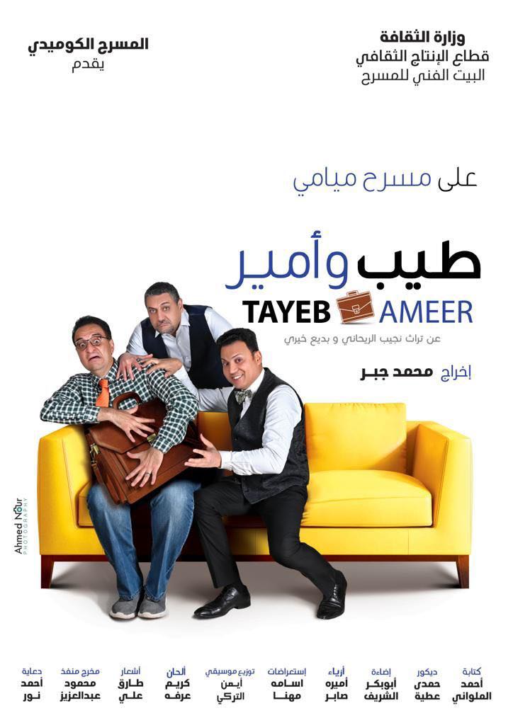 تفتتح فرقة المسرح الكوميدي العرض المسرحي الجديد " طيب وأمير " عن تراث نجيب الريحاني وبديع خيري، كتابة محمد الملاواني وإخراج محمد جبر، وذلك في تمام الثامنة والنصف مساء على مسرح ميامي بشارع طلعت حرب، وذلك بعد تطويره وتحديثه.