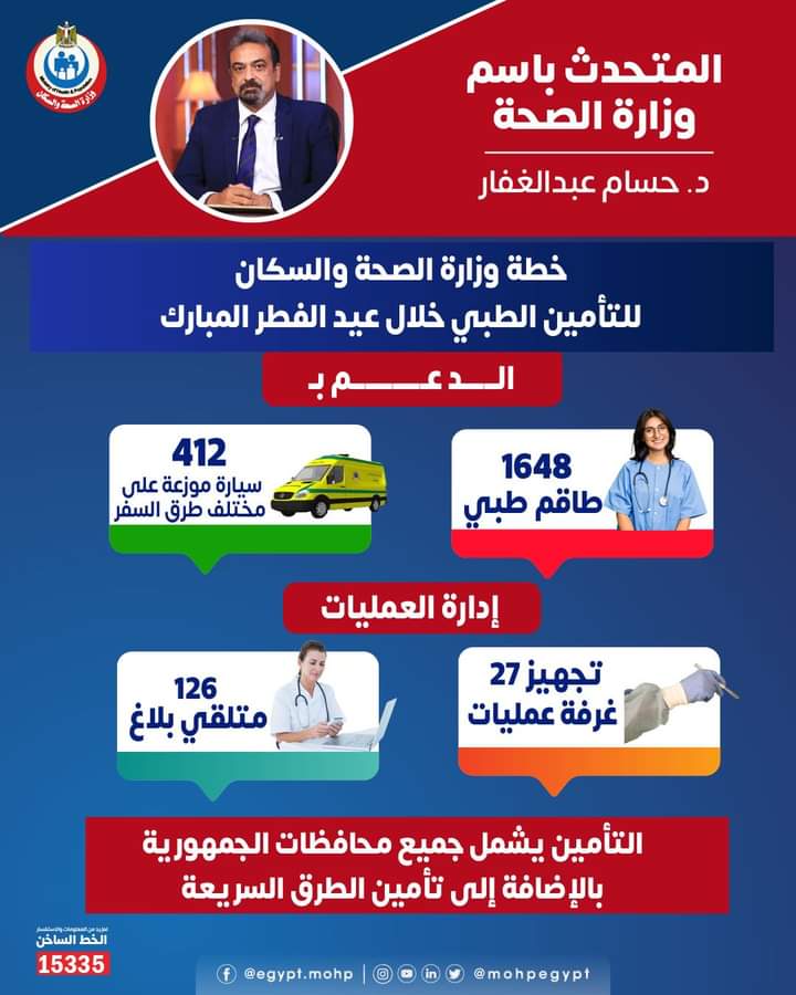 وكشفت وزارة الصحة عن تخصيص 412 سيارة إسعاف موزعة على طرق السفر وتجهيز 27 غرفة عمليات و١٦٤٨ طاقم طبي.