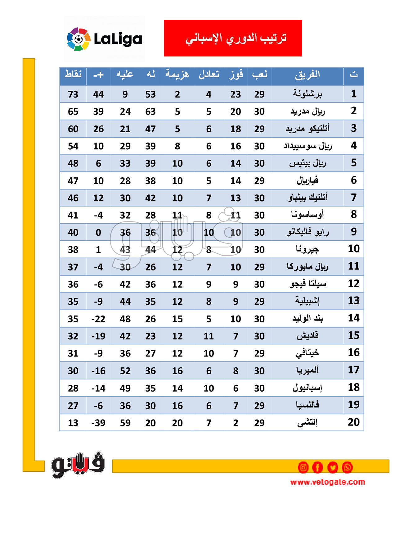 جدول ترتيب الدوري الاسباني